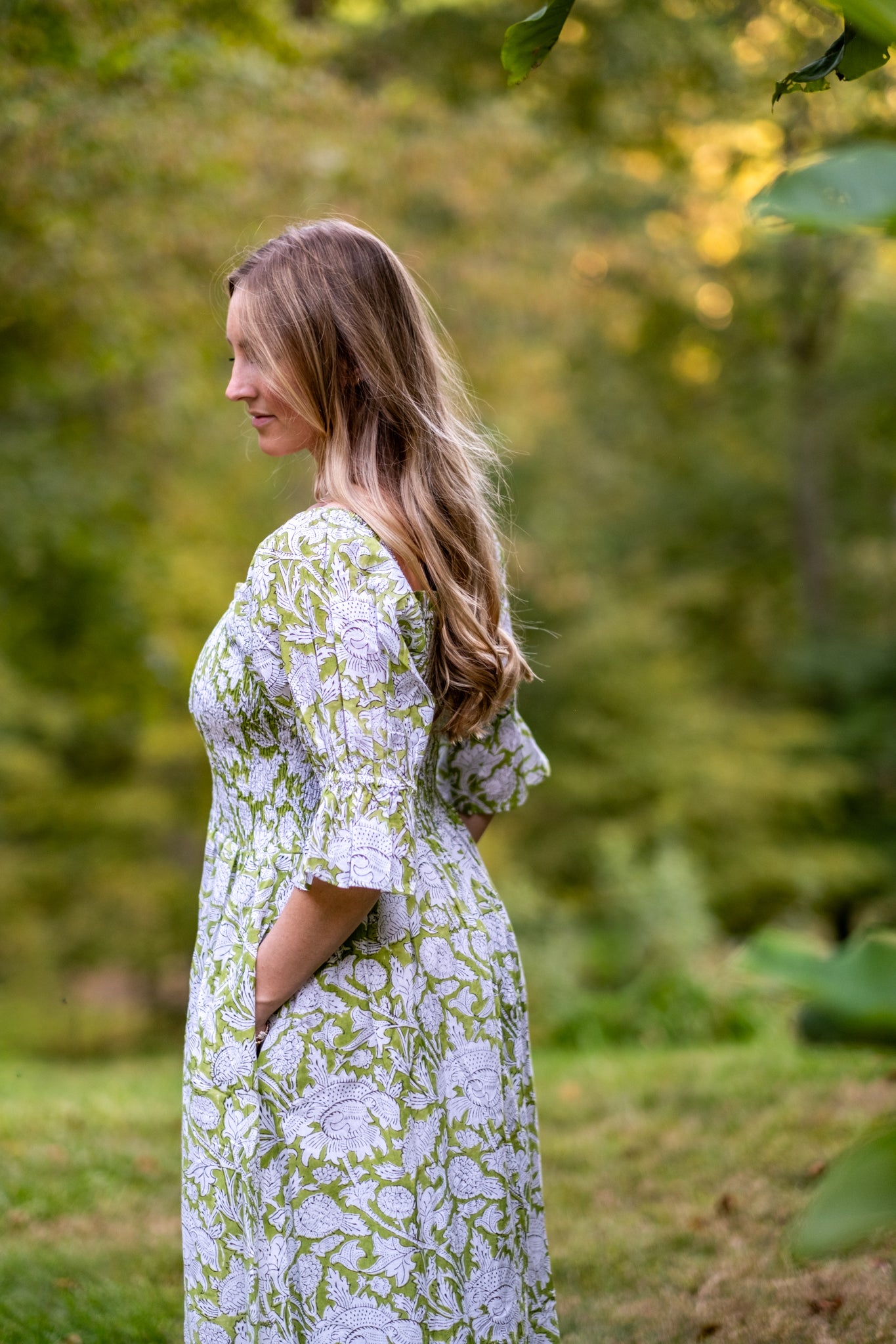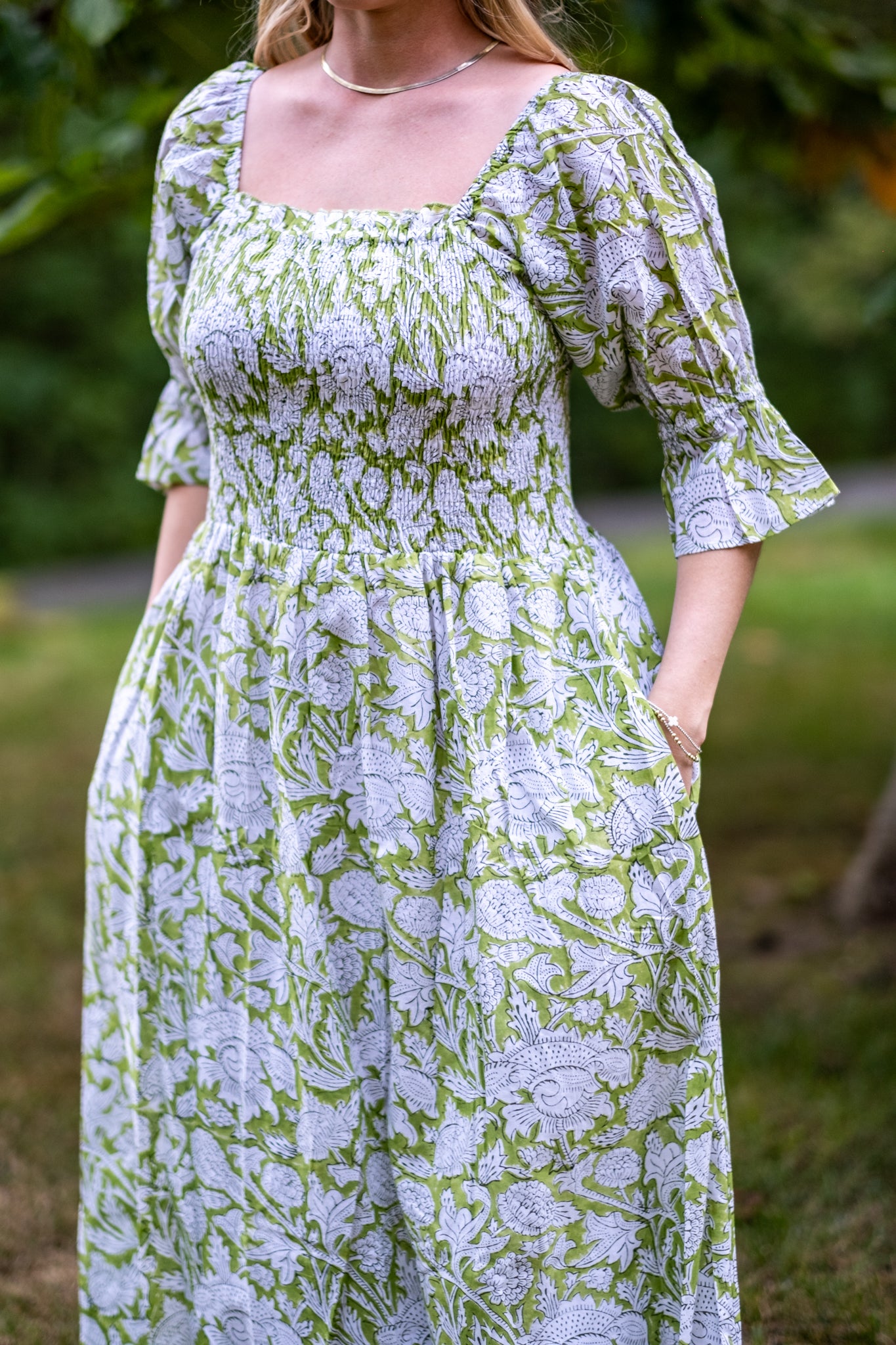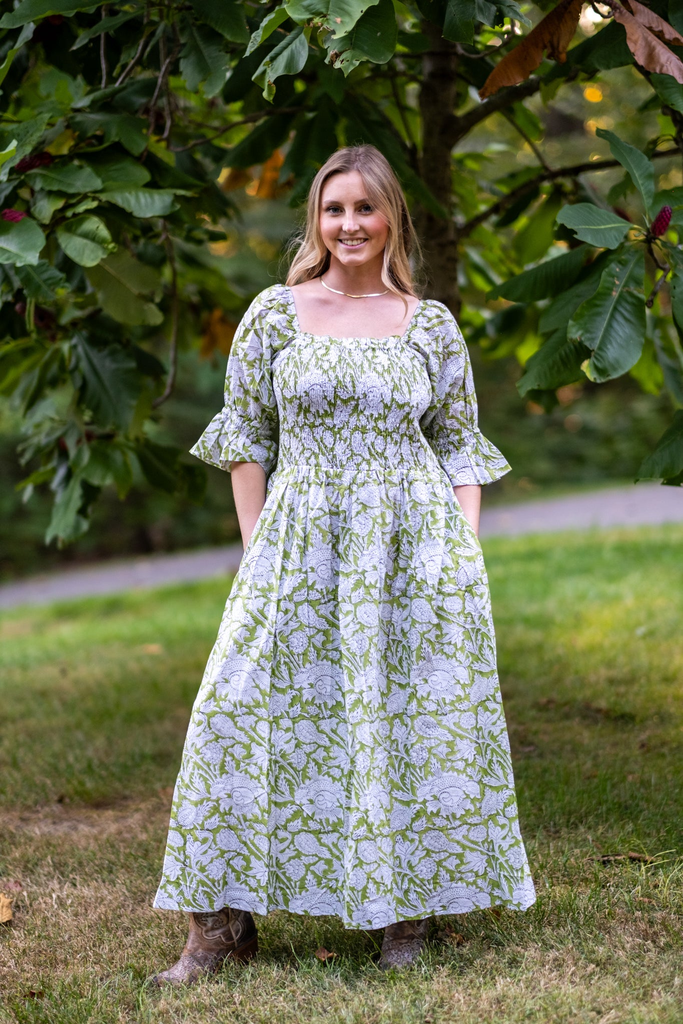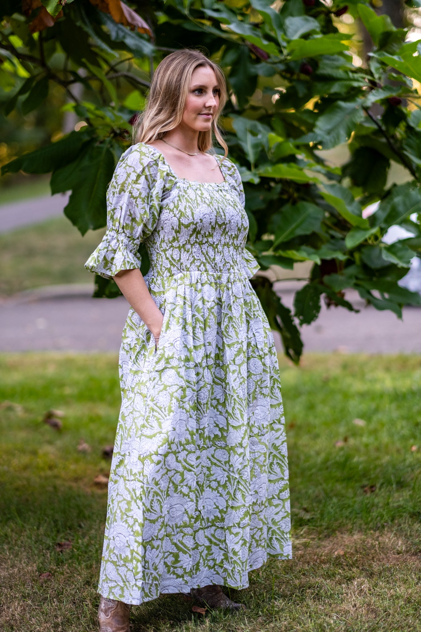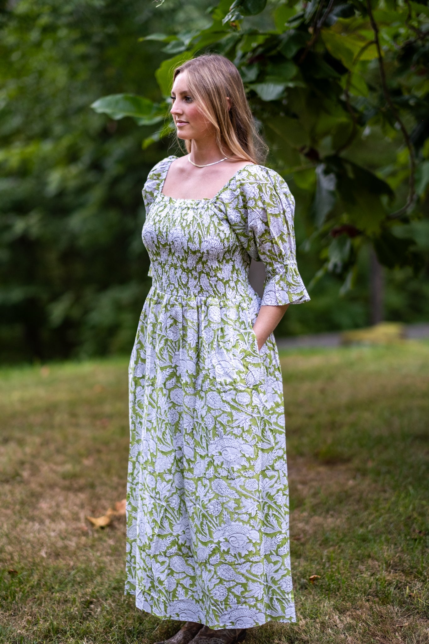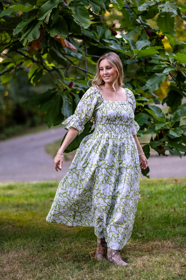 Olivia is one of our favorite dresses from the season. Twins to Rose, Olivia is a beautiful fresh light green with balloon sleeves with tapered flare at the end. Enjoy a stretchy, supportive bodice and the perfect long skirt. The dress features two deep pockets, and a soft cotton voile lining for modesty and comfort. The beautiful A line dress falls at the calves, dress it up with heels or cowboy boots and sunglasses or throw on your favorite sandals.