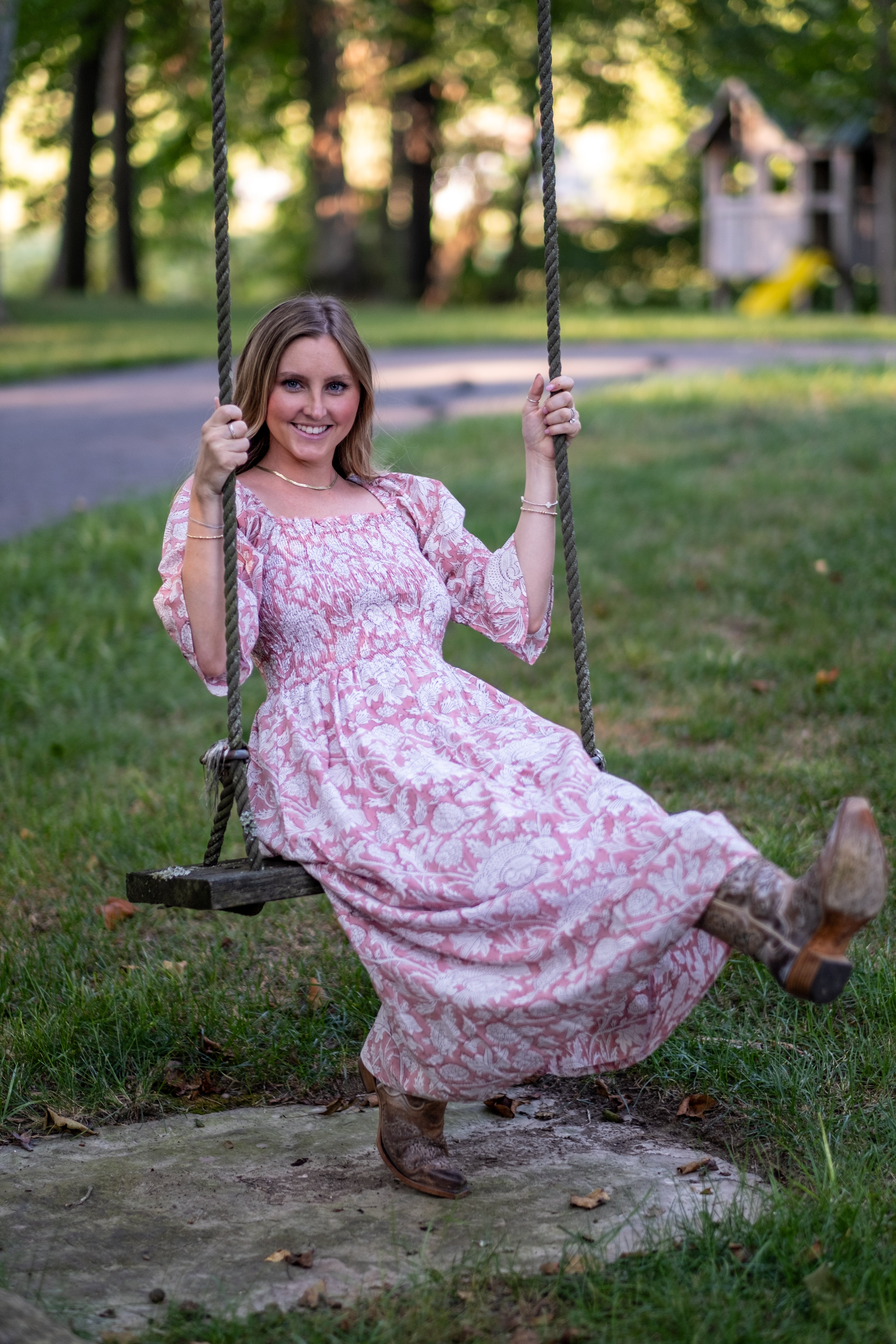 Rose is one of our favorite dresses from the season. Rose is a beautiful dusty rose pink with balloon sleeves with tapered flare at the end. Enjoy a stretchy, supportive bodice and the perfect long skirt. The dress features two deep pockets, and a soft cotton voile lining for modesty and comfort. The beautiful A line dress falls at the calves, dress it up with heels or cowboy boots and sunglasses or throw on your favorite sandals.