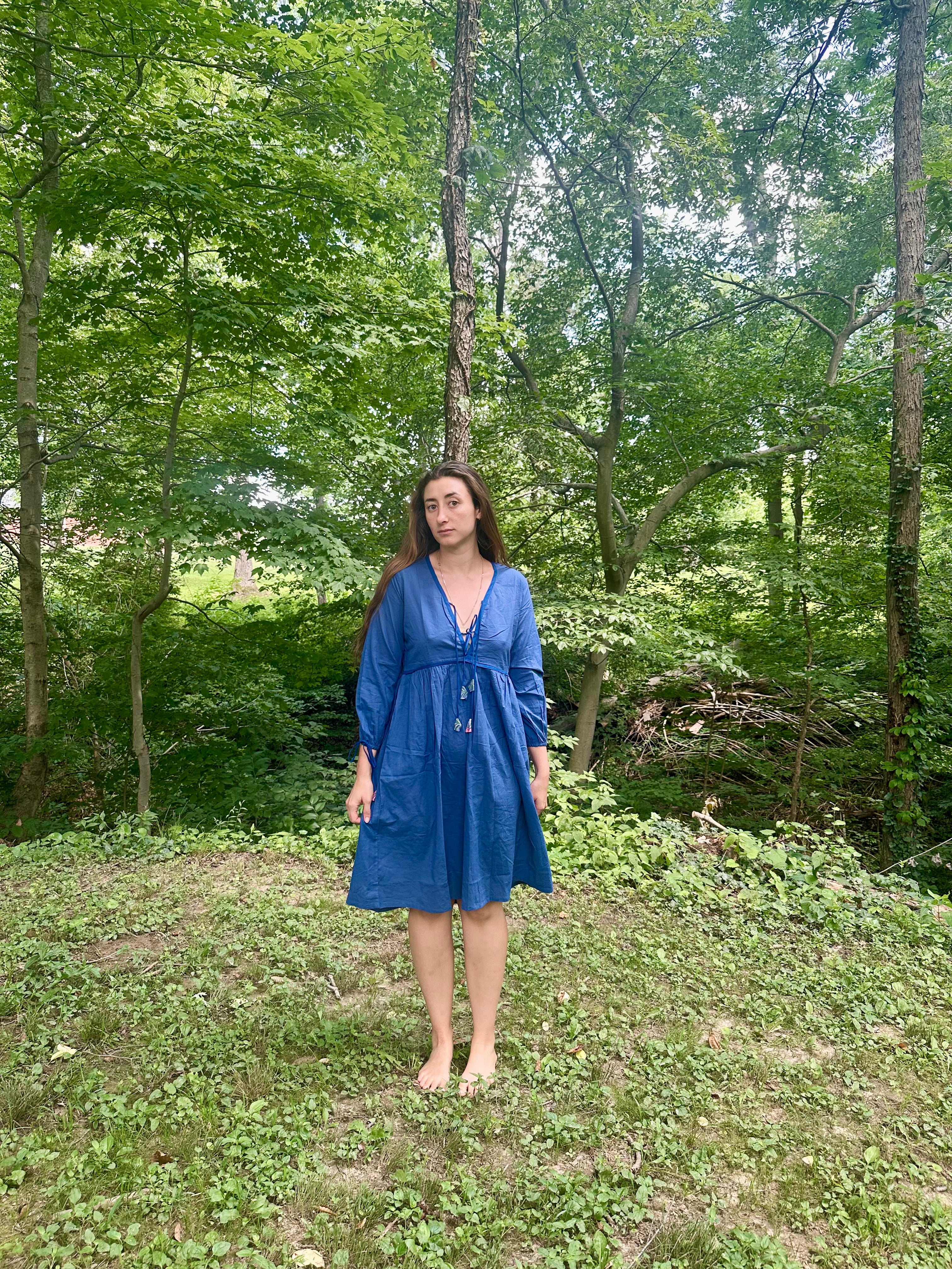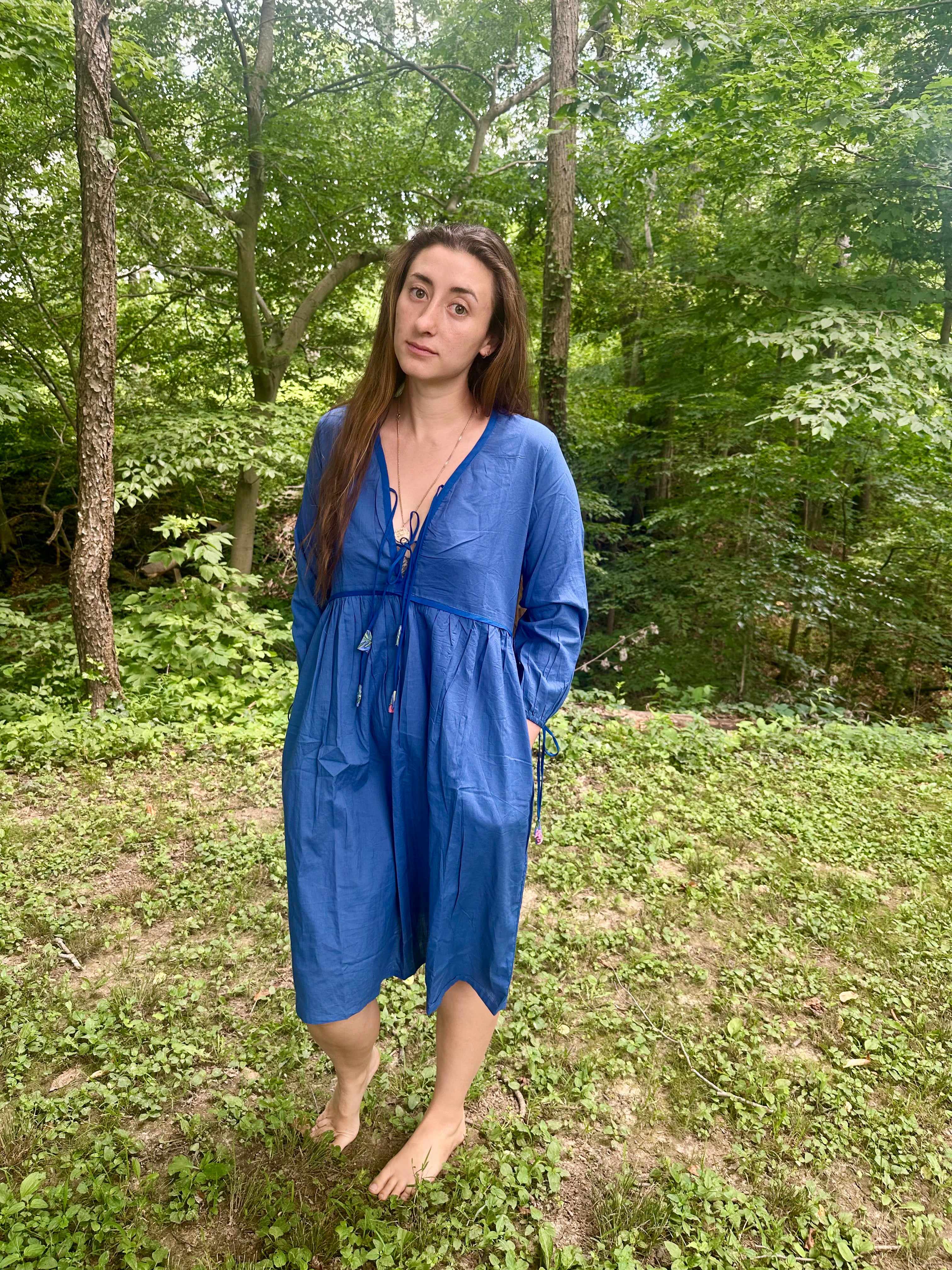 Made from 100% organic cotton, this dress is hand dyed by vegetable dyes and hand made by hand block artisans in Jaipur. Designed in rural Ohio, the Clara dress is a 3/4 sleeve everyday dress with comfy side pockets, a plunging V neck with 2 ties for modesty. The ties on the bust are mirrored on the sleeves and are detailed with hand block dyed fabric. Enjoy this knee length dress on warm or cool days, as the breathable cotton will keep you comfortable in most mild weather.