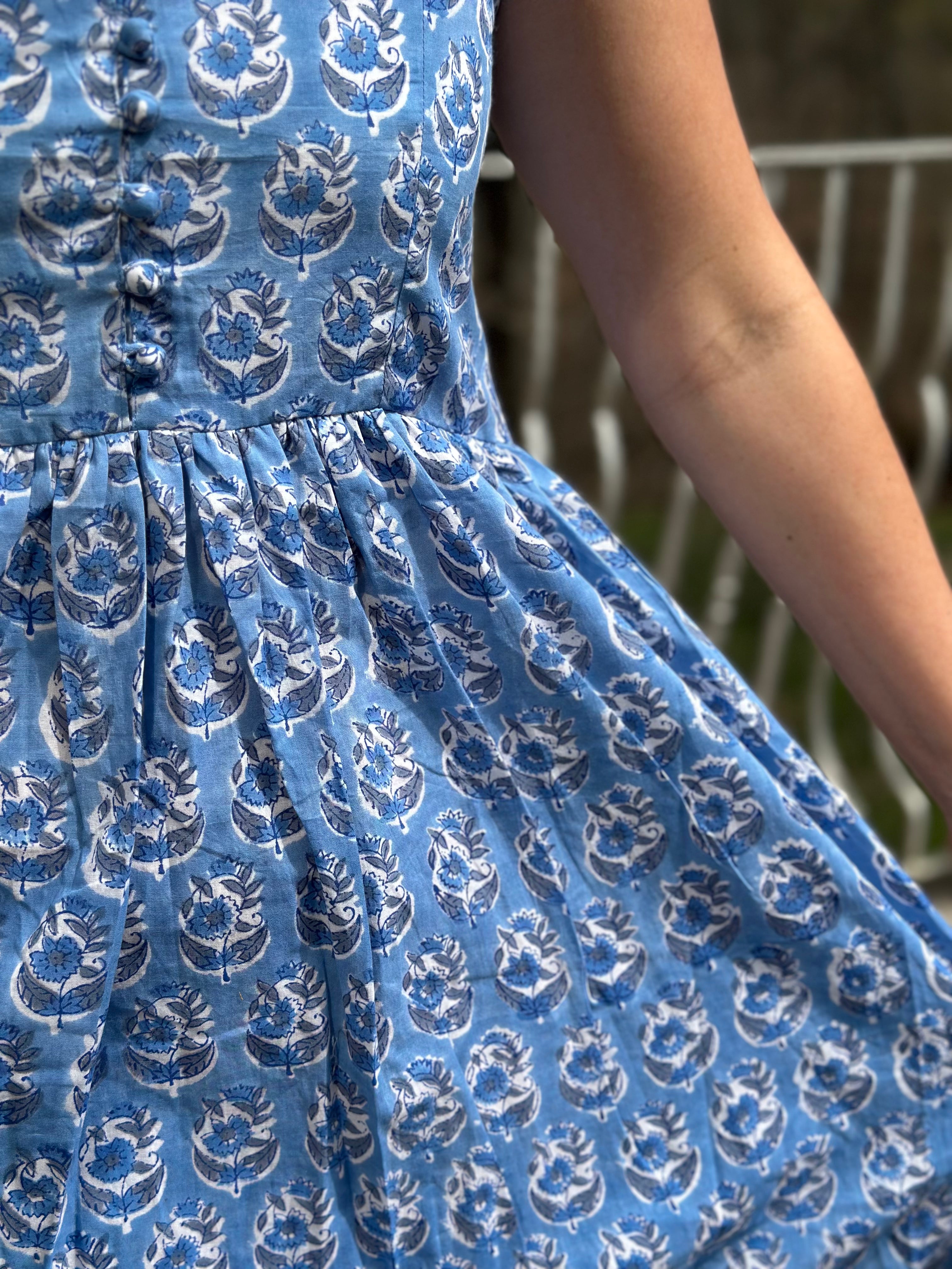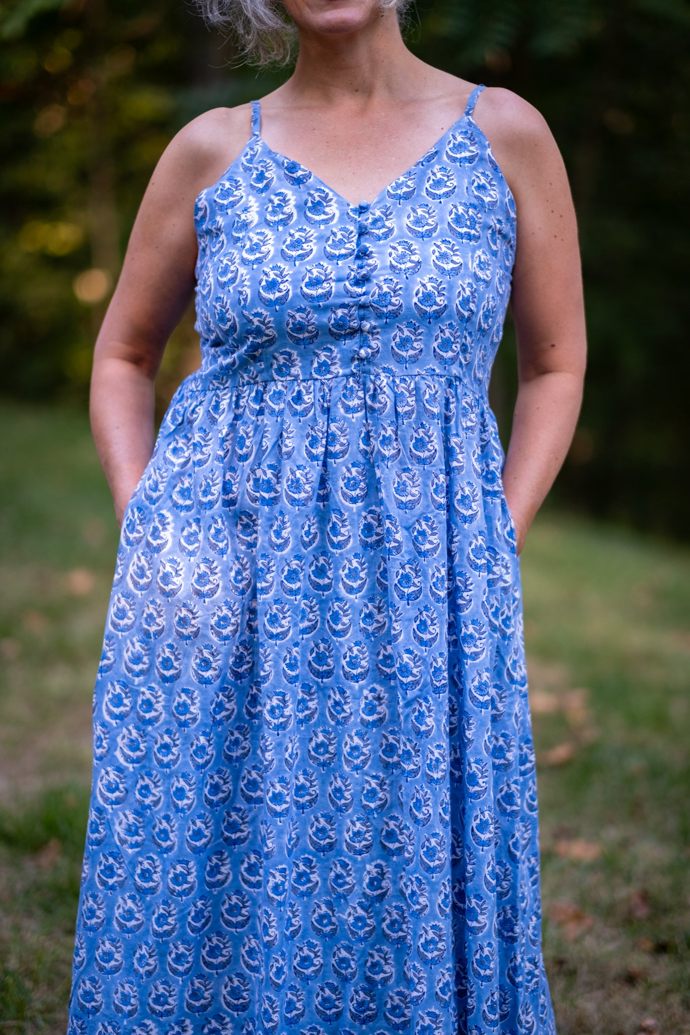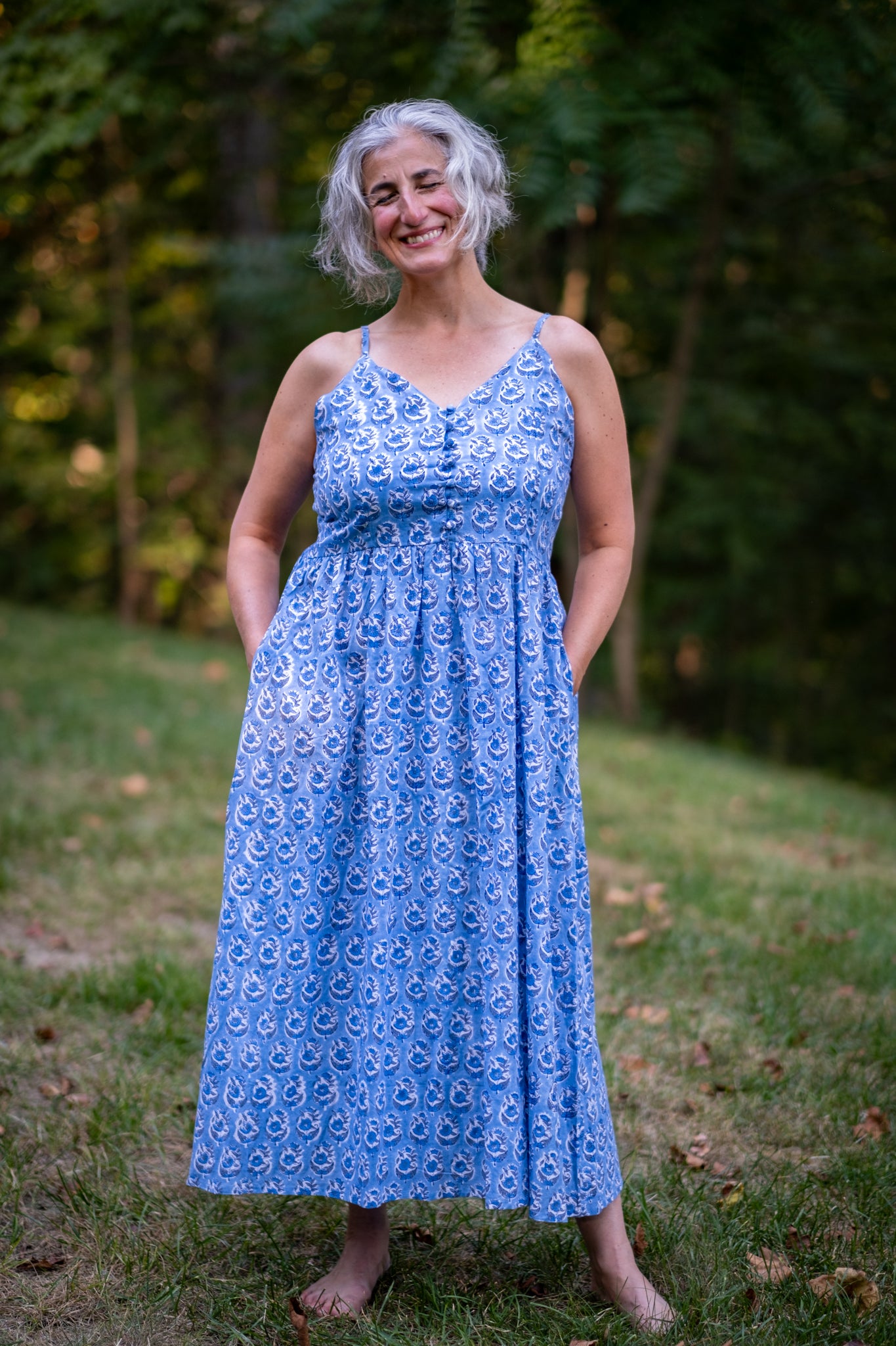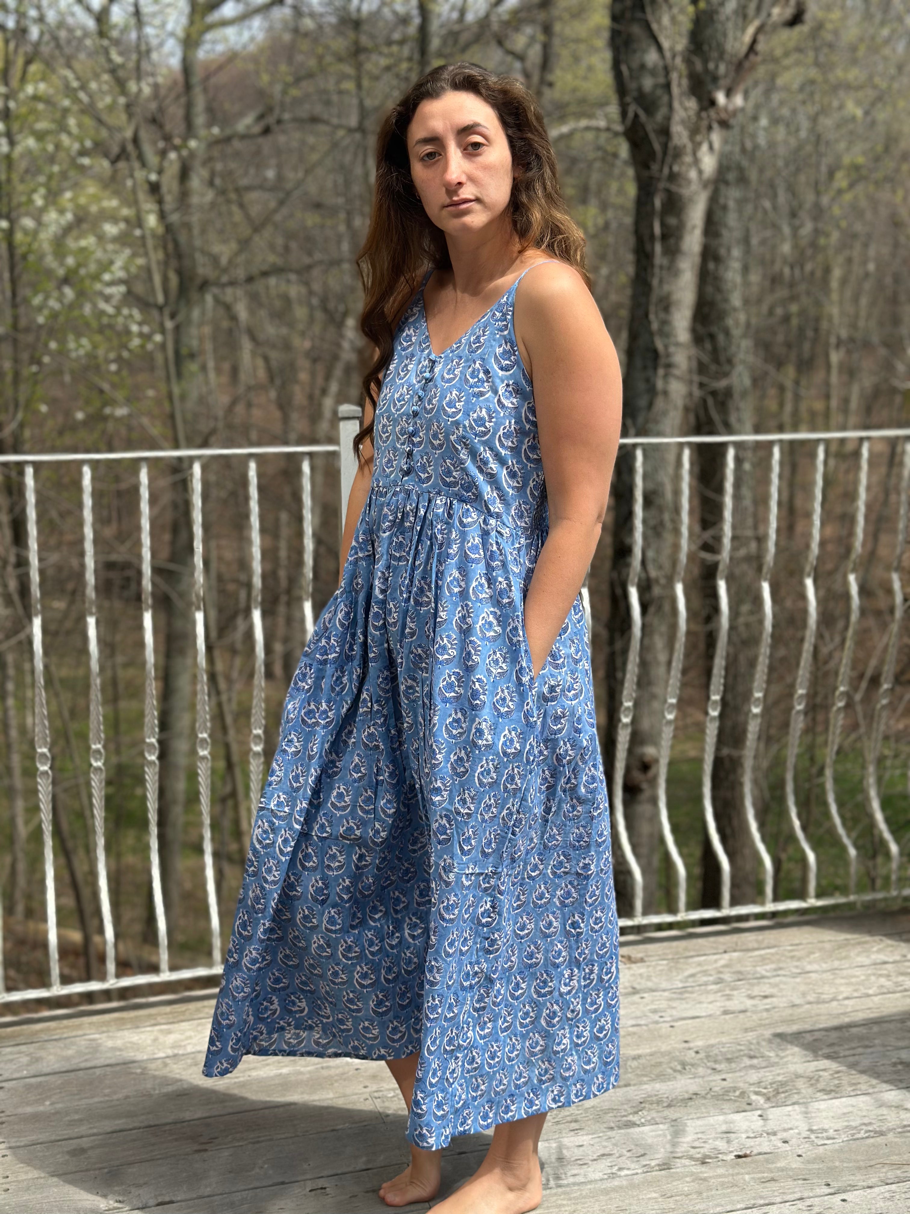 Fall in love with Daria, made from 100% organic cotton and hand painted with vegetable dyes. Daria features a powder blue fabric with blue sunflower details, a modest V neck, and accent buttons down the bust. Enjoy the two pockets that come in the maxi skirt. This dress is fitted through the bodice and flowy through the ankle length skirt.