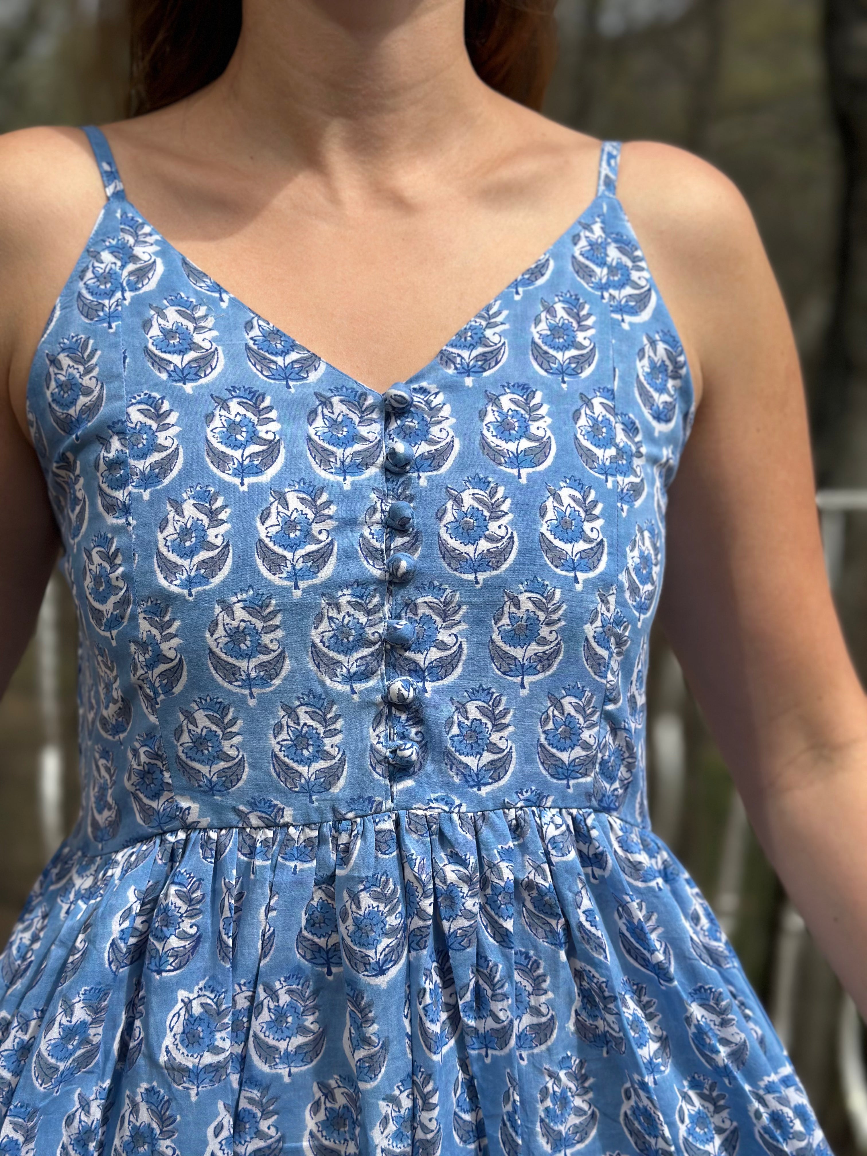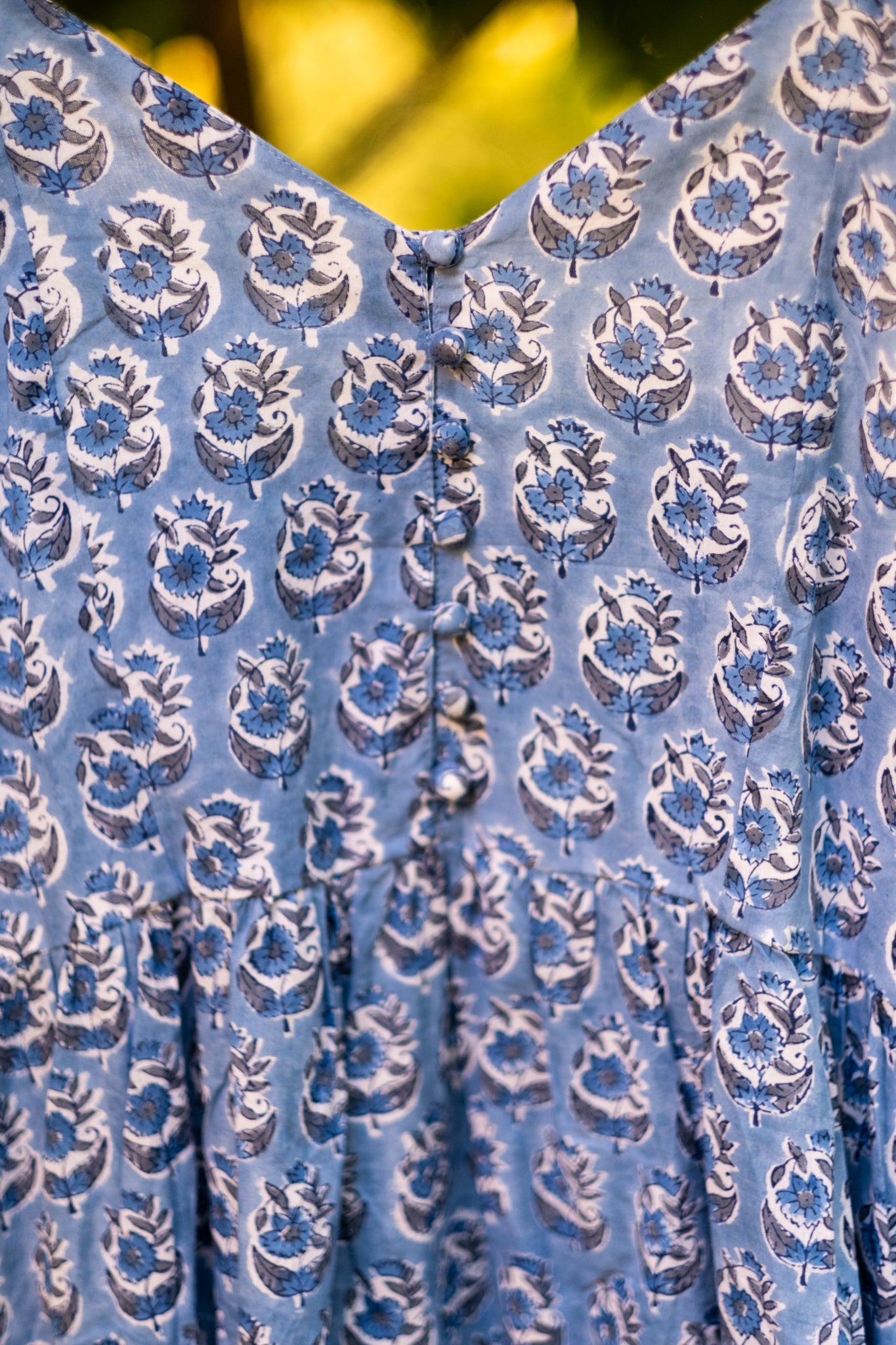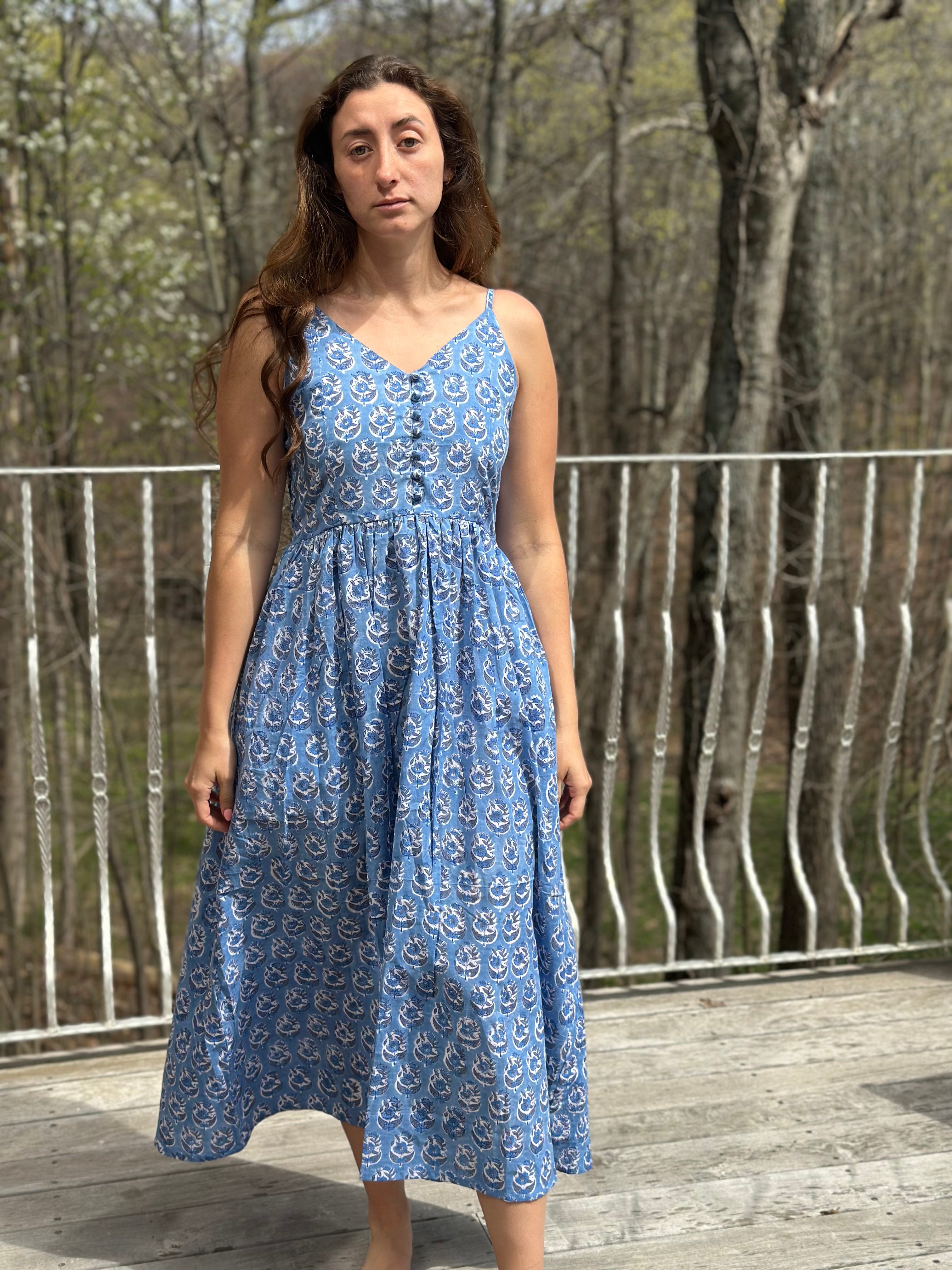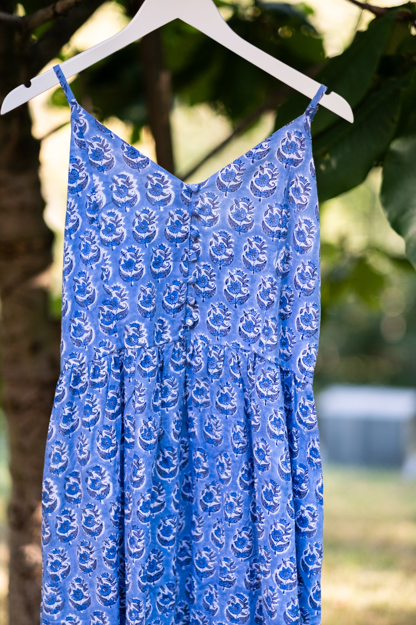 Fall in love with Daria, made from 100% organic cotton and hand painted with vegetable dyes. Daria features a powder blue fabric with blue sunflower details, a modest V neck, and accent buttons down the bust. Enjoy the two pockets that come in the maxi skirt. This dress is fitted through the bodice and flowy through the ankle length skirt.