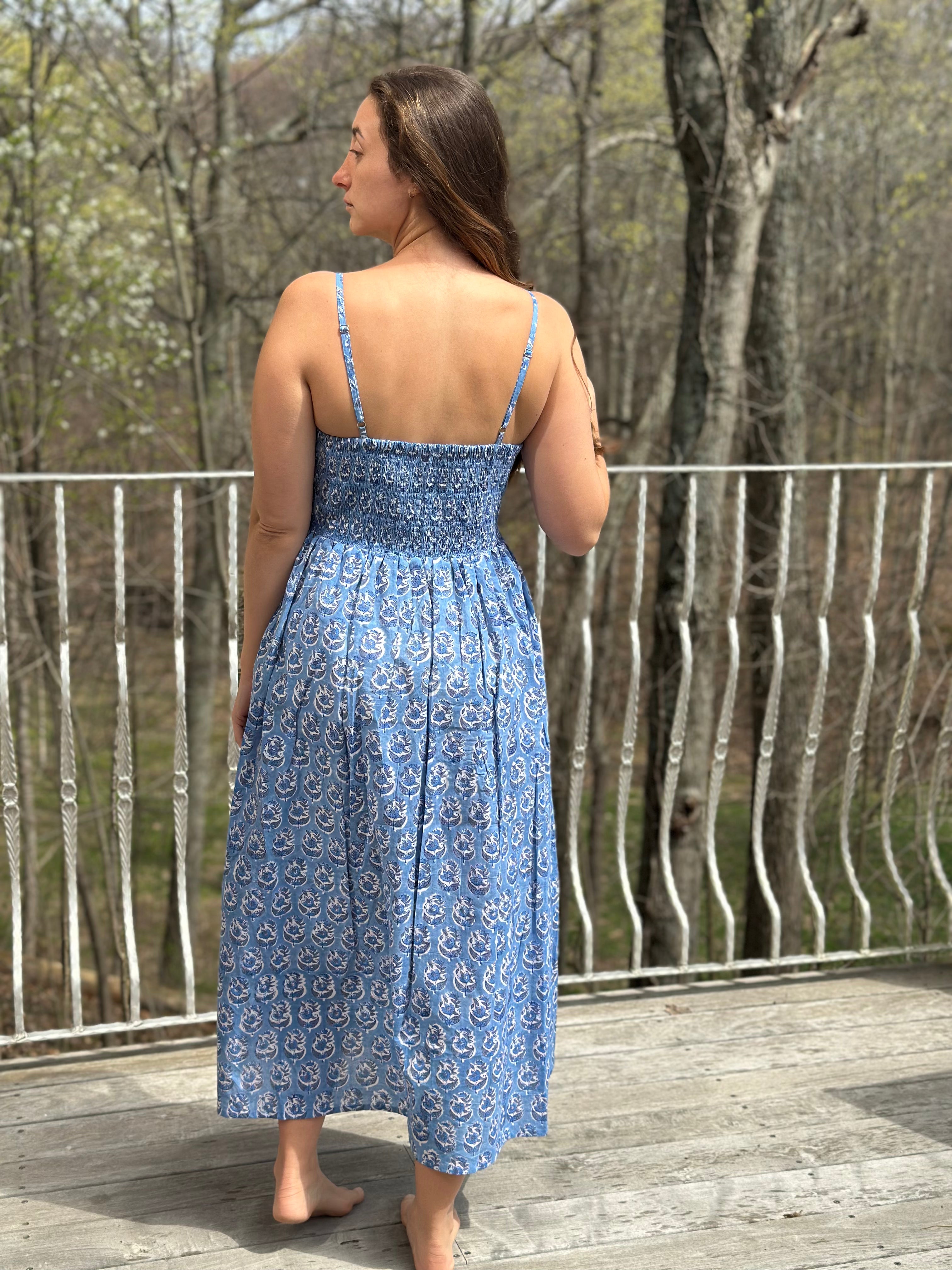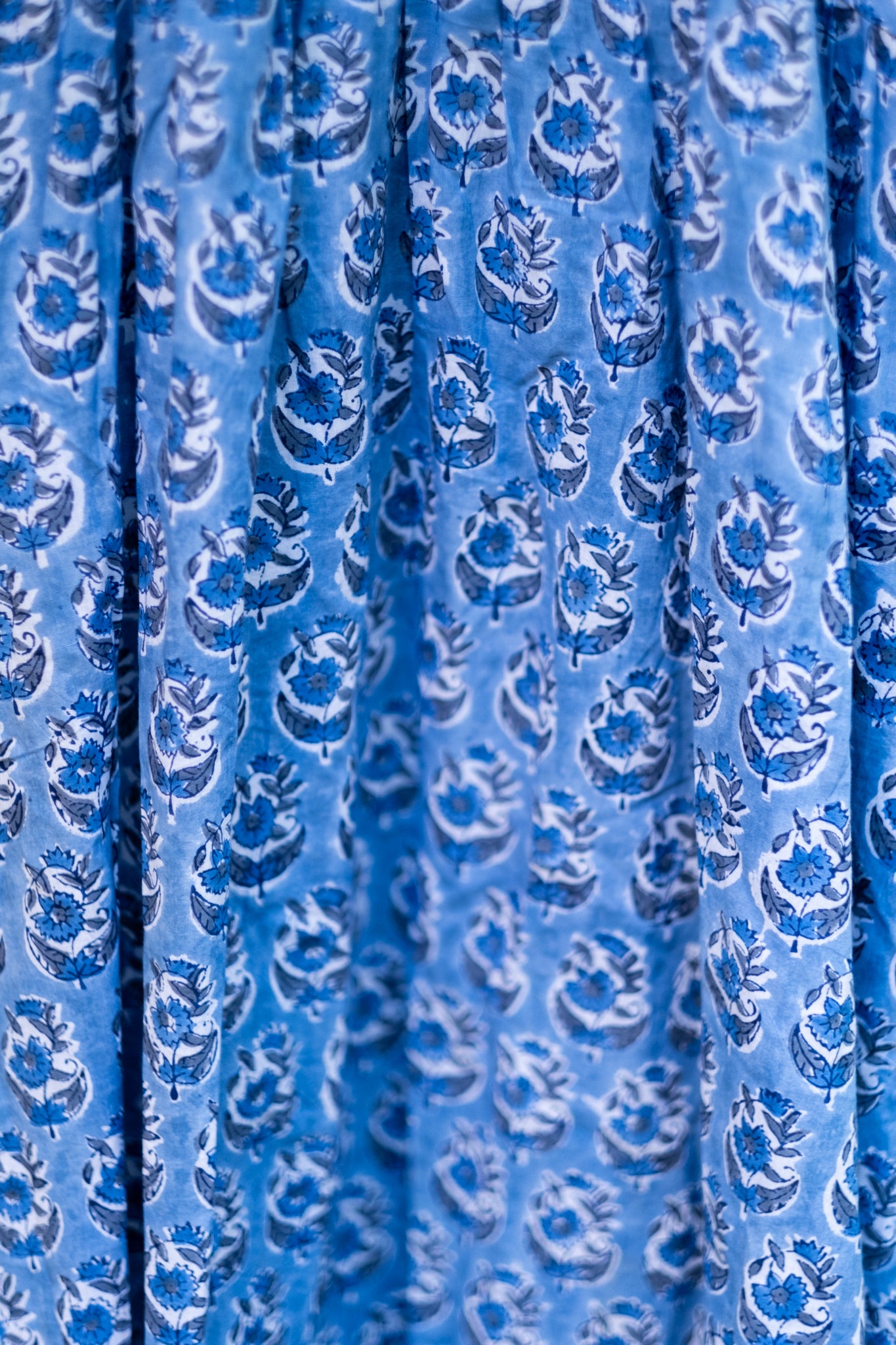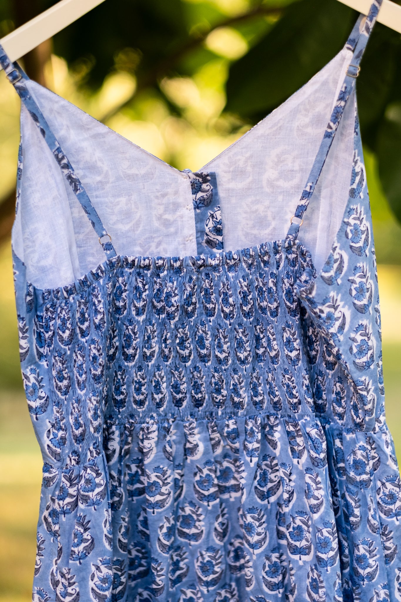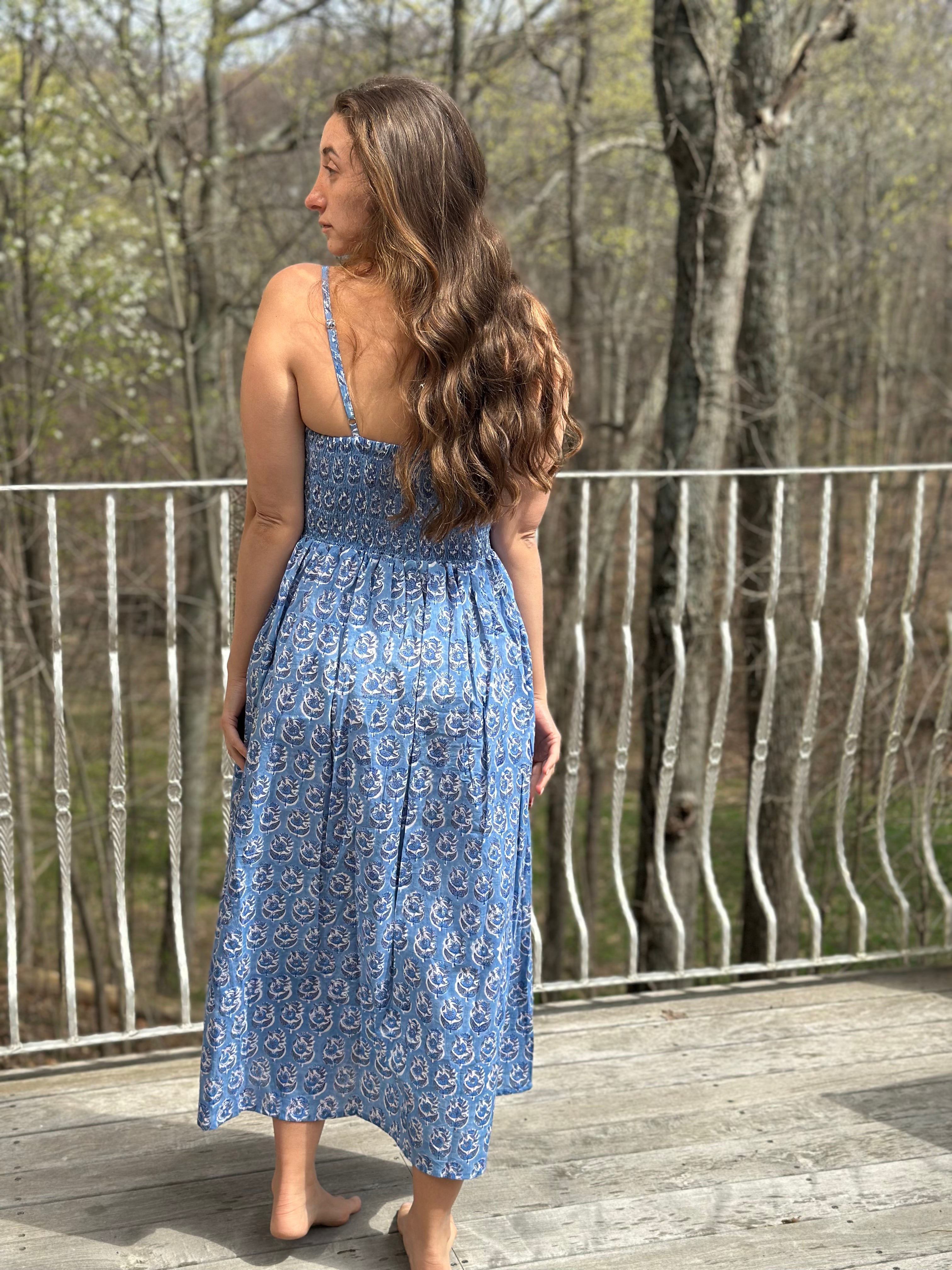 Fall in love with Daria, made from 100% organic cotton and hand painted with vegetable dyes. Daria features a powder blue fabric with blue sunflower details, a modest V neck, and accent buttons down the bust. Enjoy the two pockets that come in the maxi skirt. This dress is fitted through the bodice and flowy through the ankle length skirt.