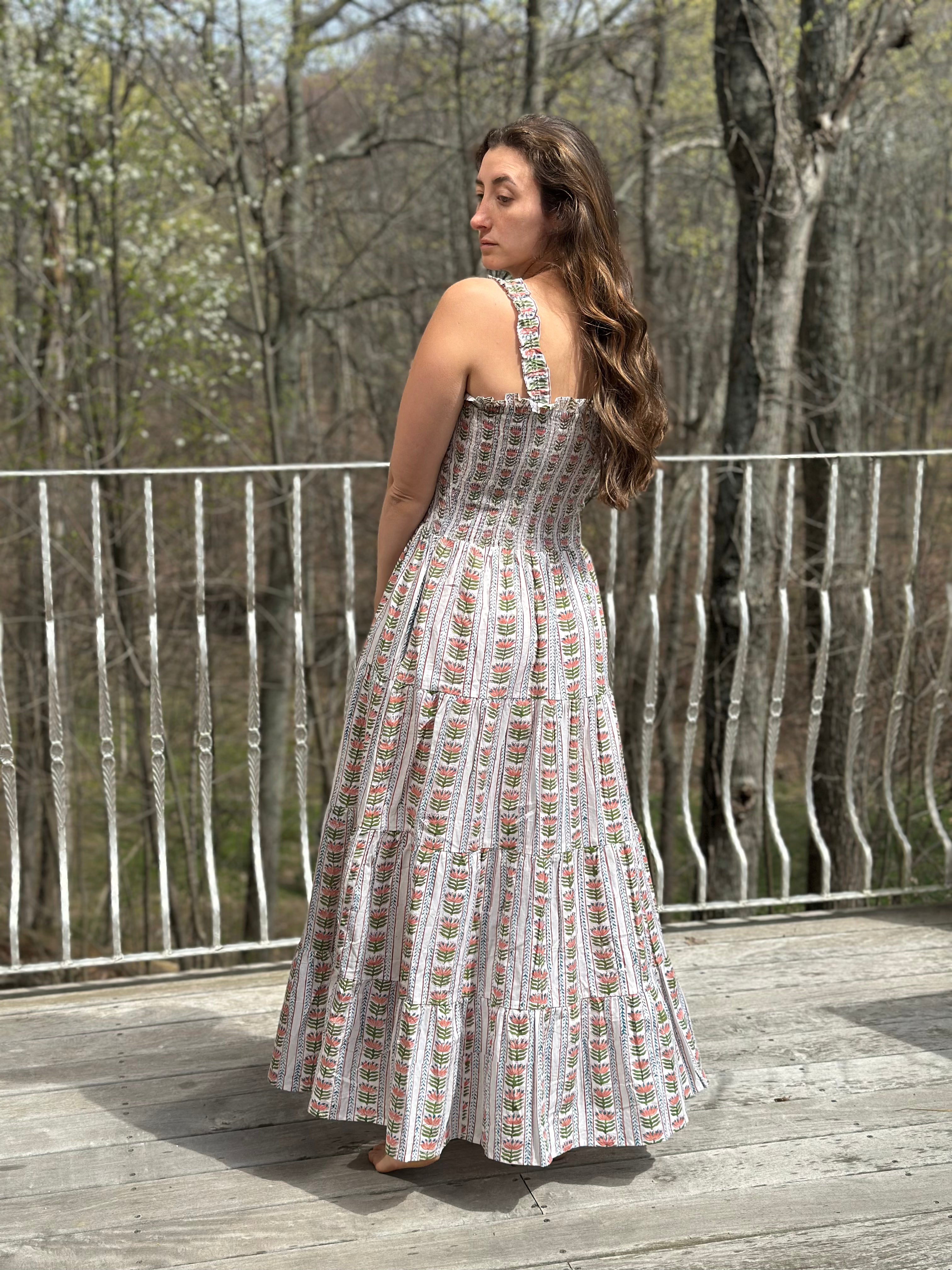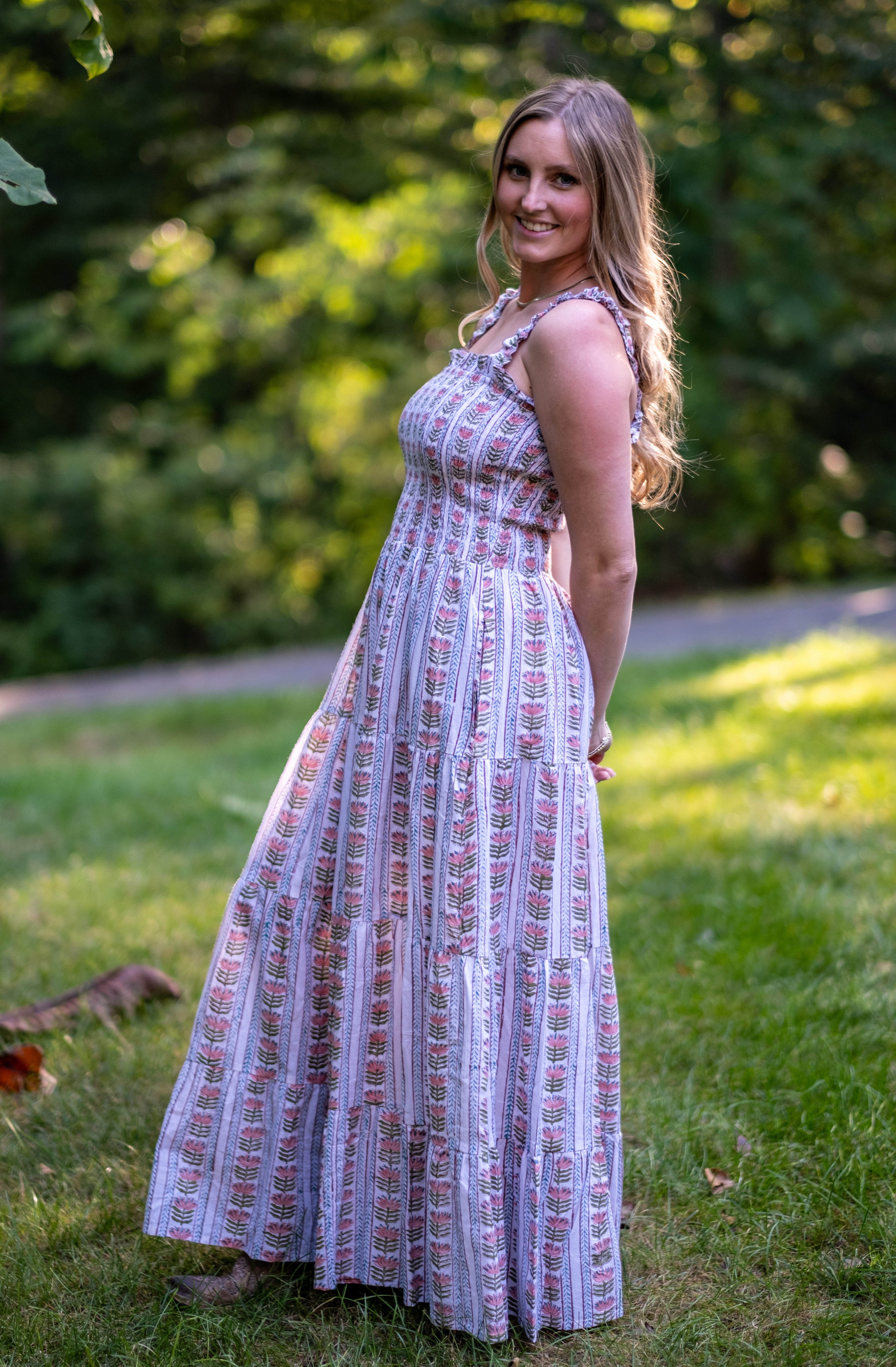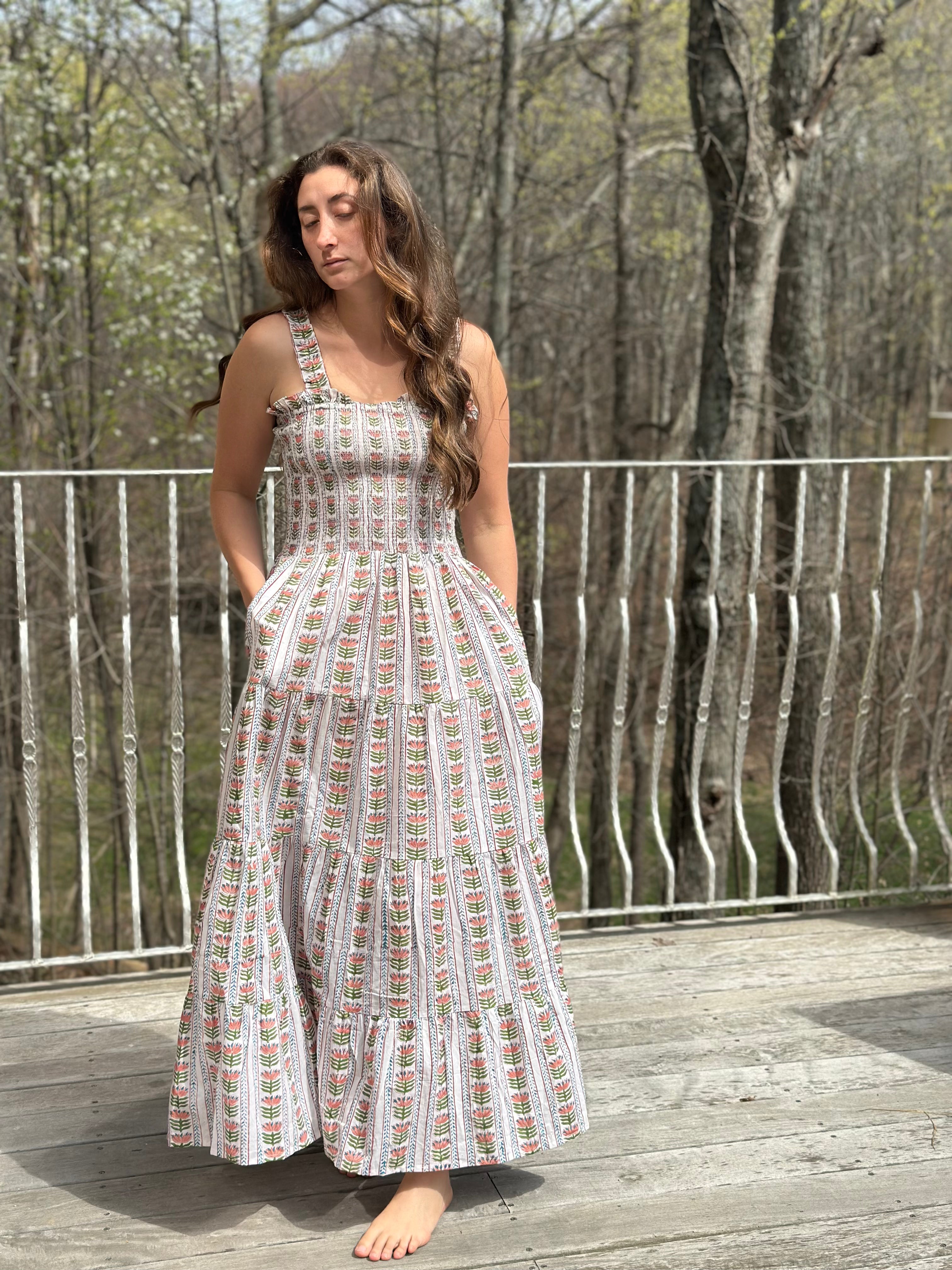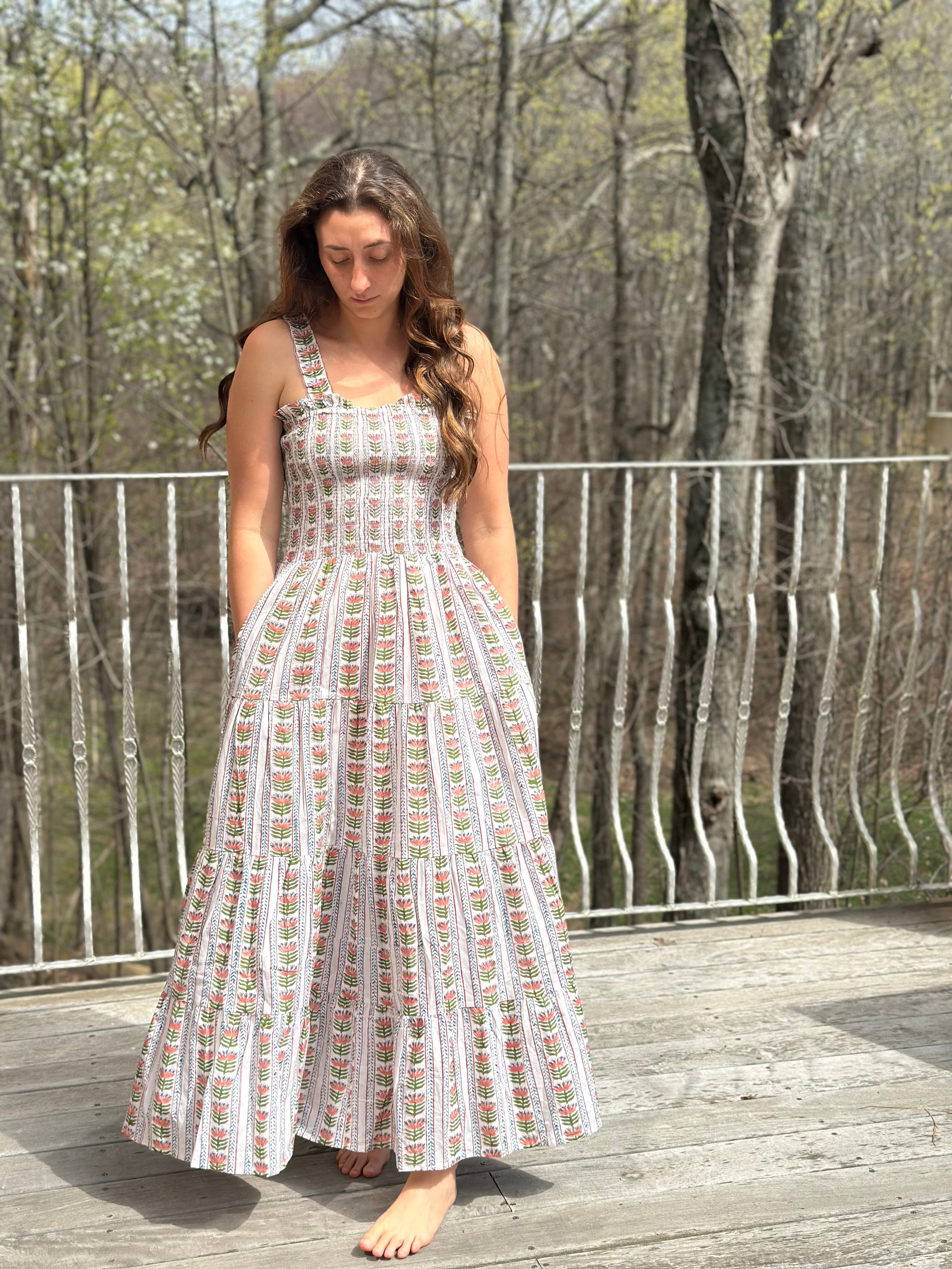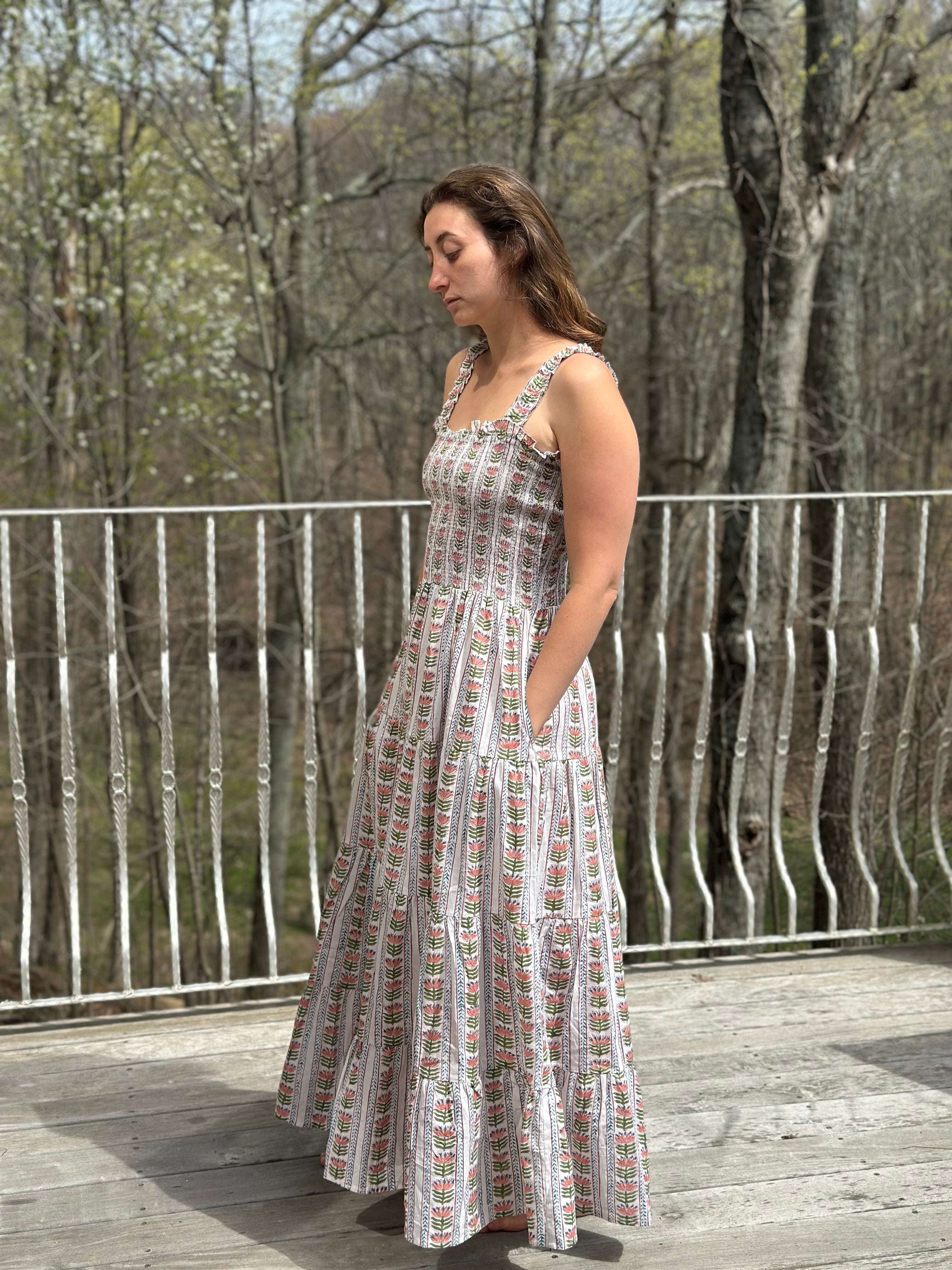 Meet Valerie, made from 100% organic cotton and hand painted with vegetable dyes. Valerie features a soft repeating fabric painted with beautiful blooming tulips. Enjoy the two pockets that come in the maxi length skirt. This dress is form fitting through the square neck bodice and is tiered through the skirt, creating a beautiful A frame shape.
