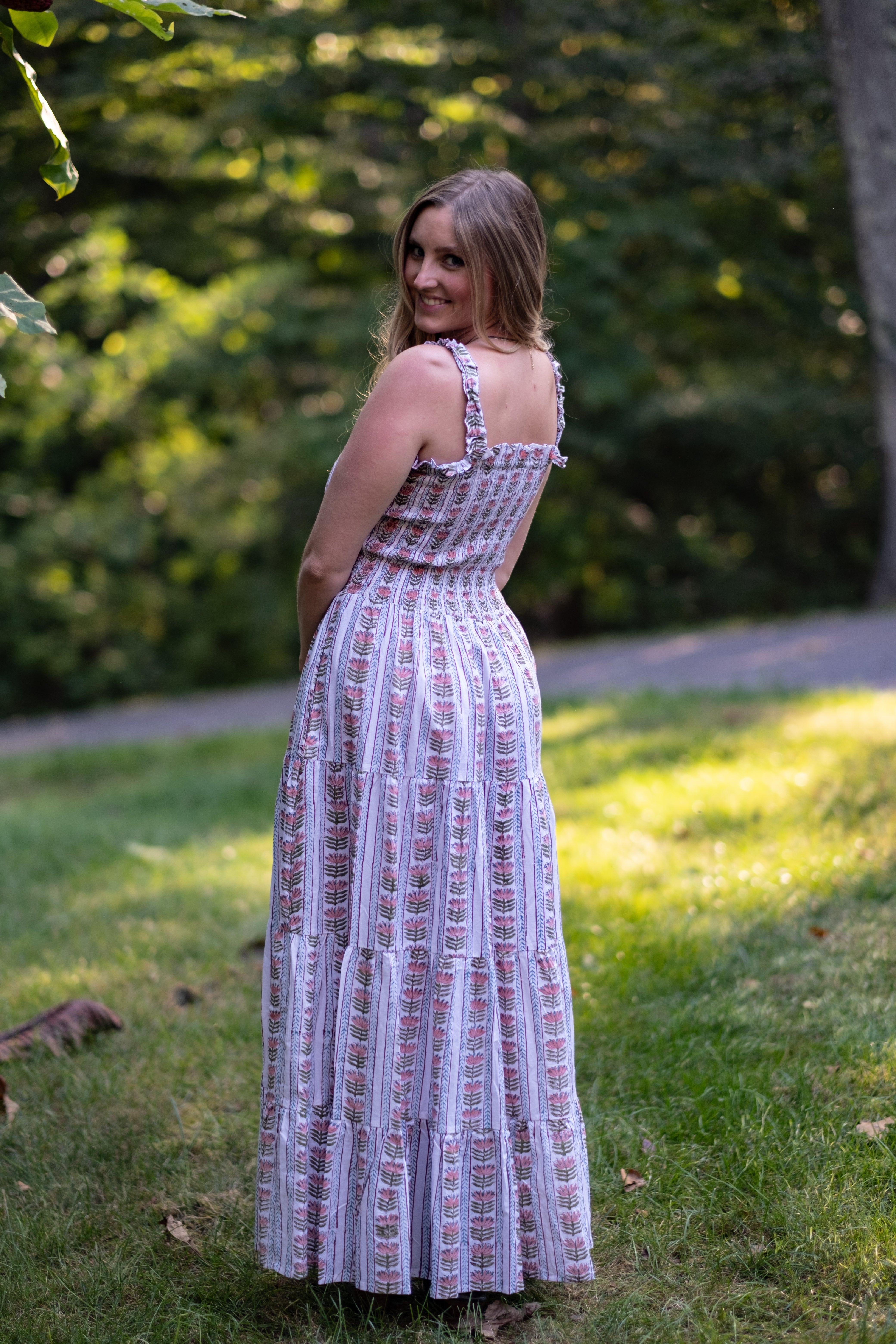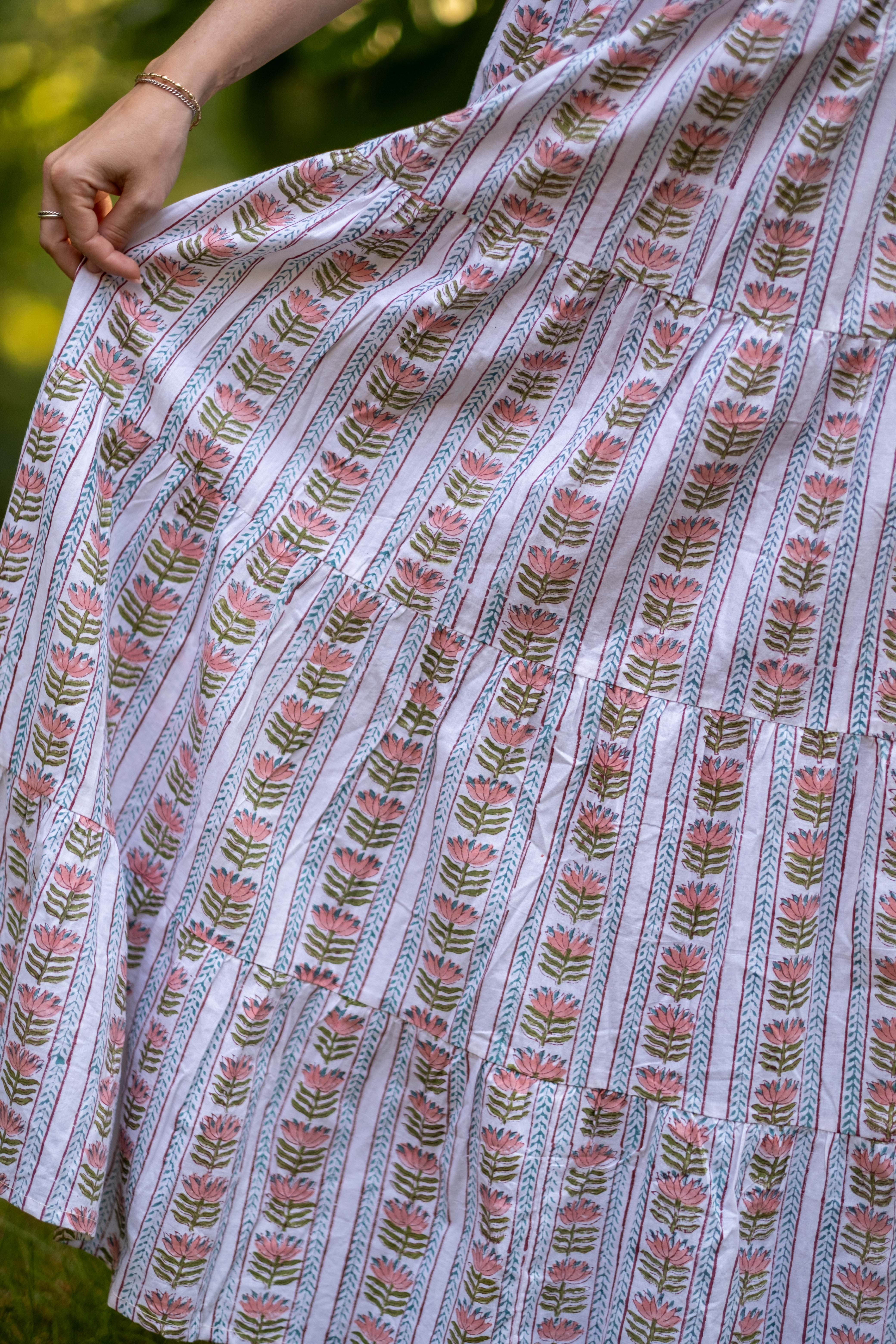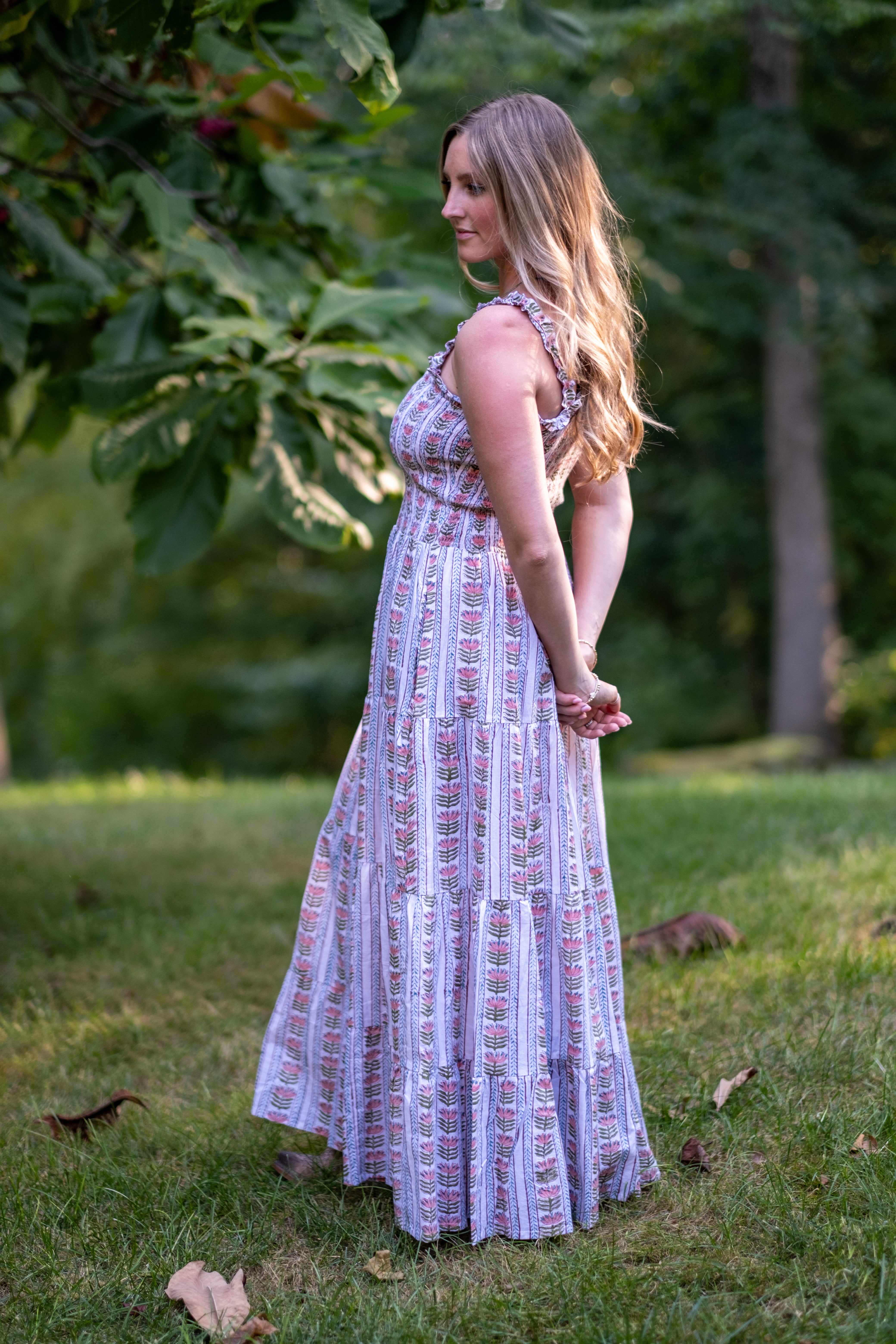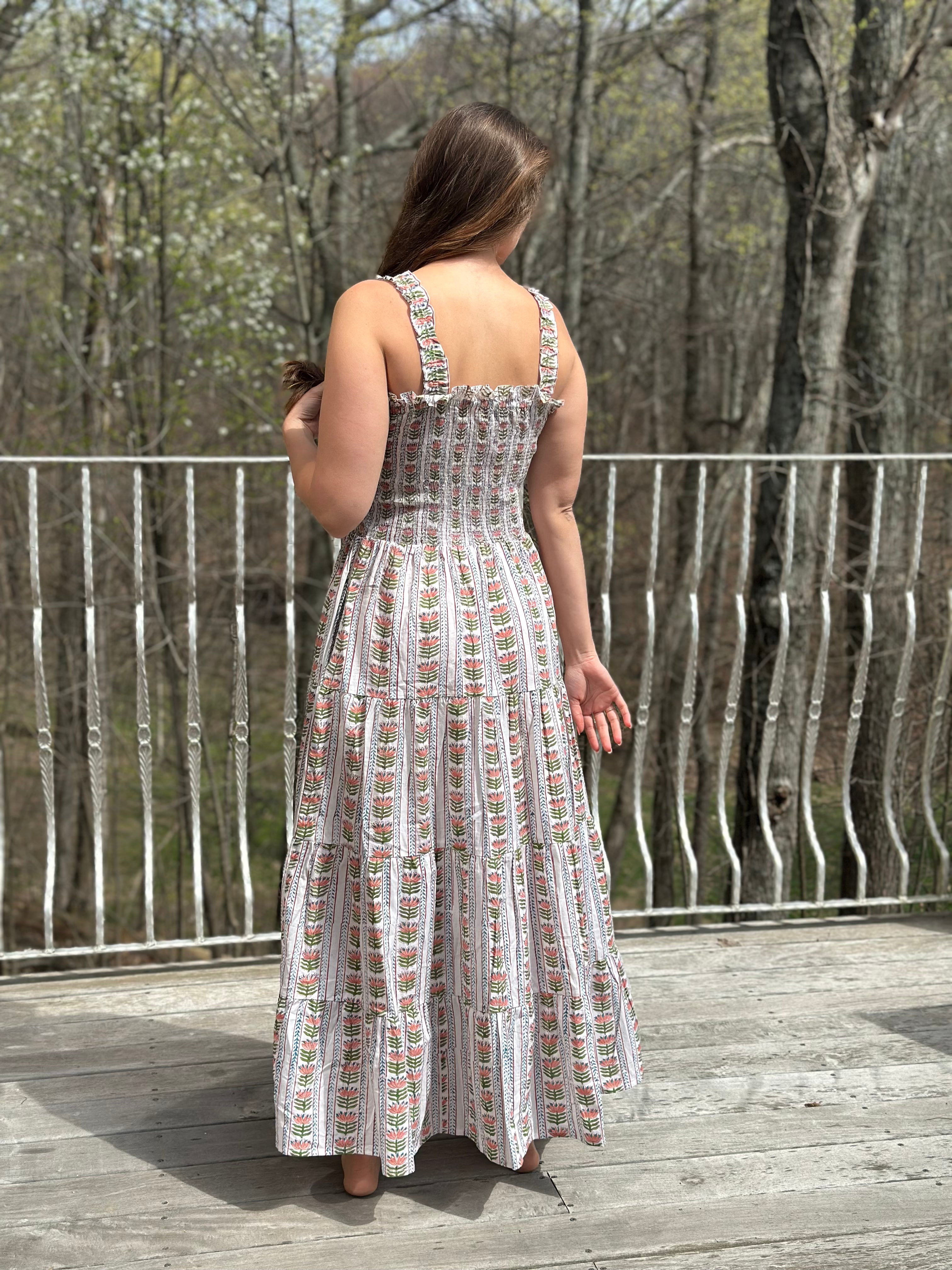 Meet Valerie, made from 100% organic cotton and hand painted with vegetable dyes. Valerie features a soft repeating fabric painted with beautiful blooming tulips. Enjoy the two pockets that come in the maxi length skirt. This dress is form fitting through the square neck bodice and is tiered through the skirt, creating a beautiful A frame shape.