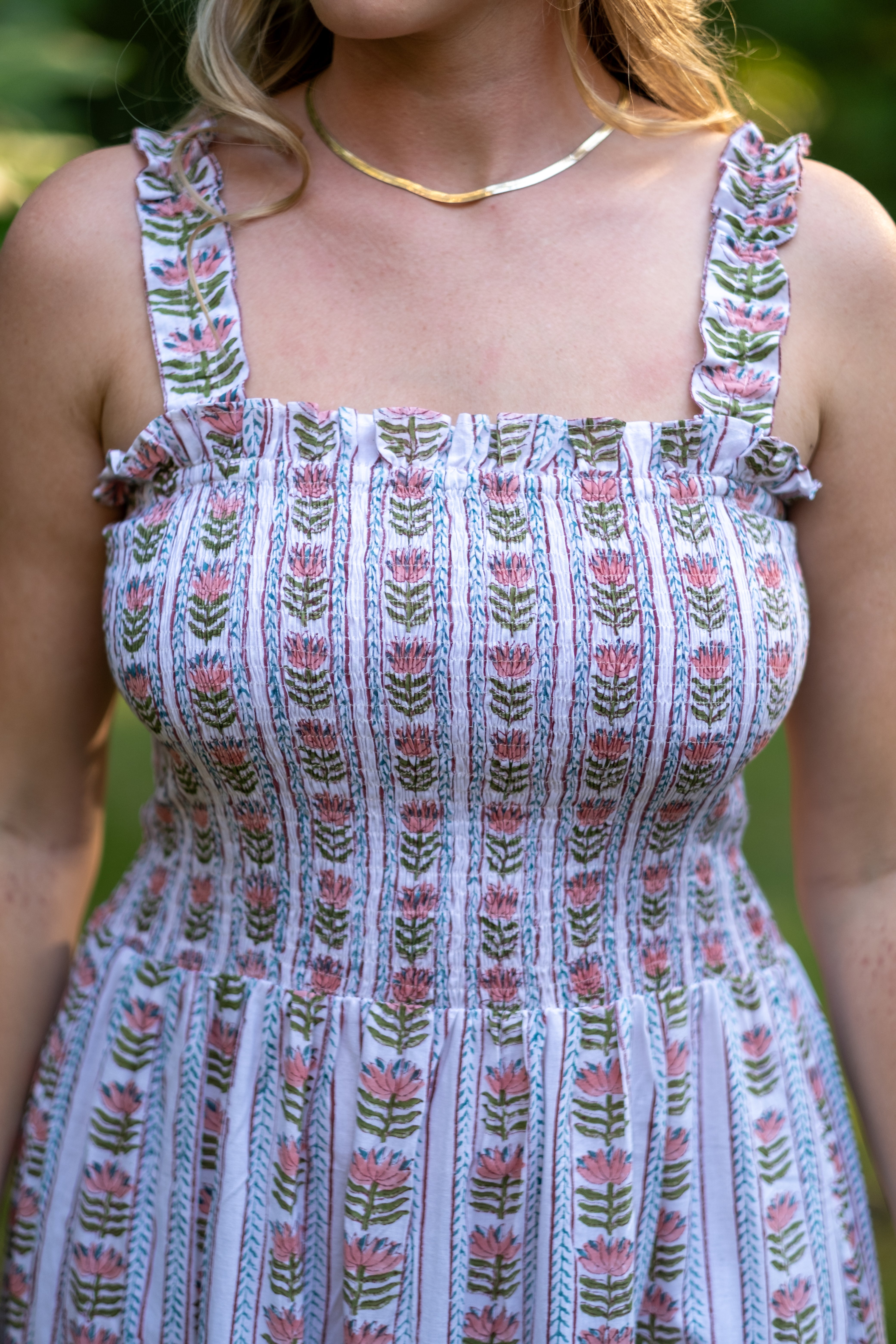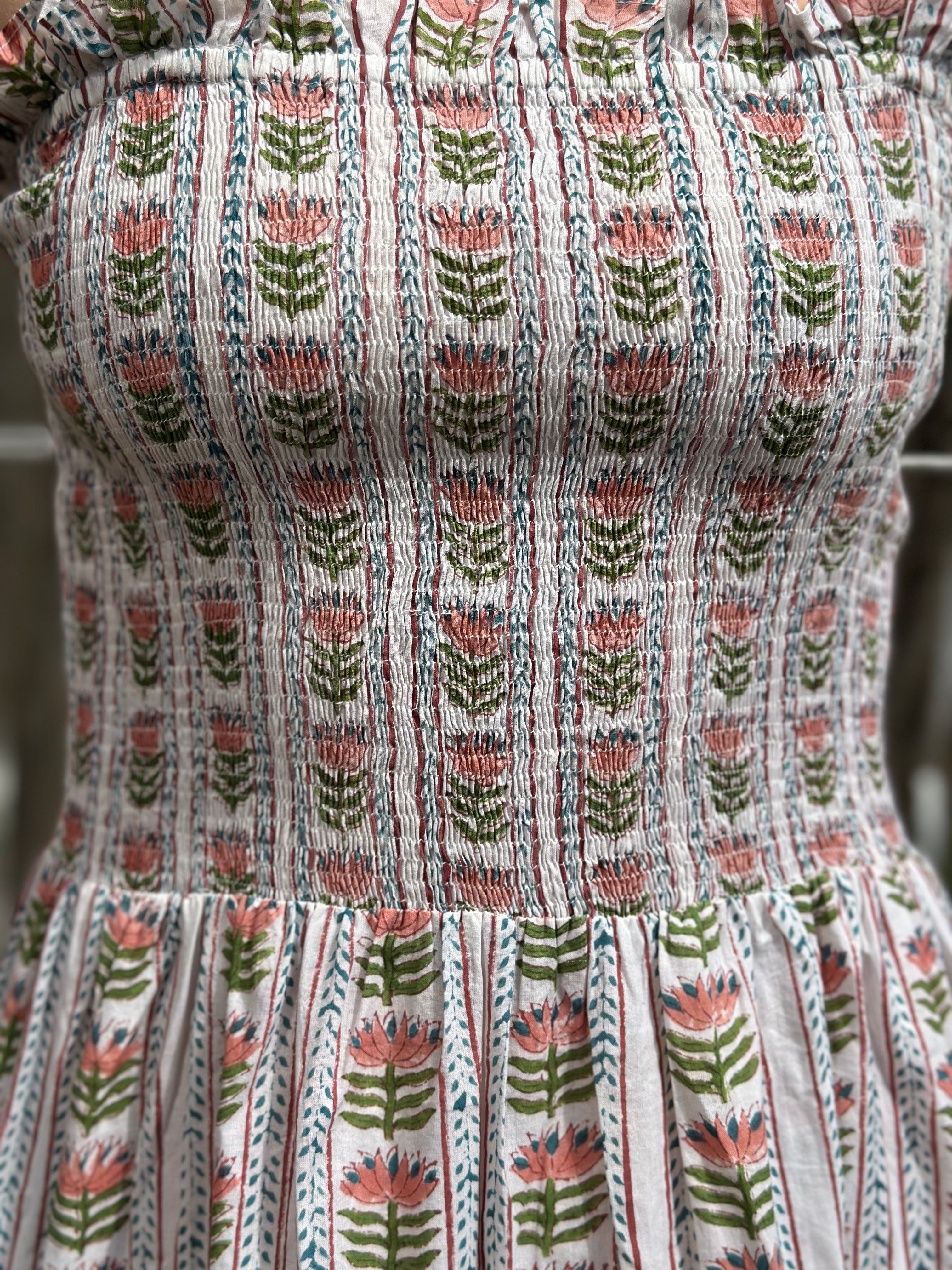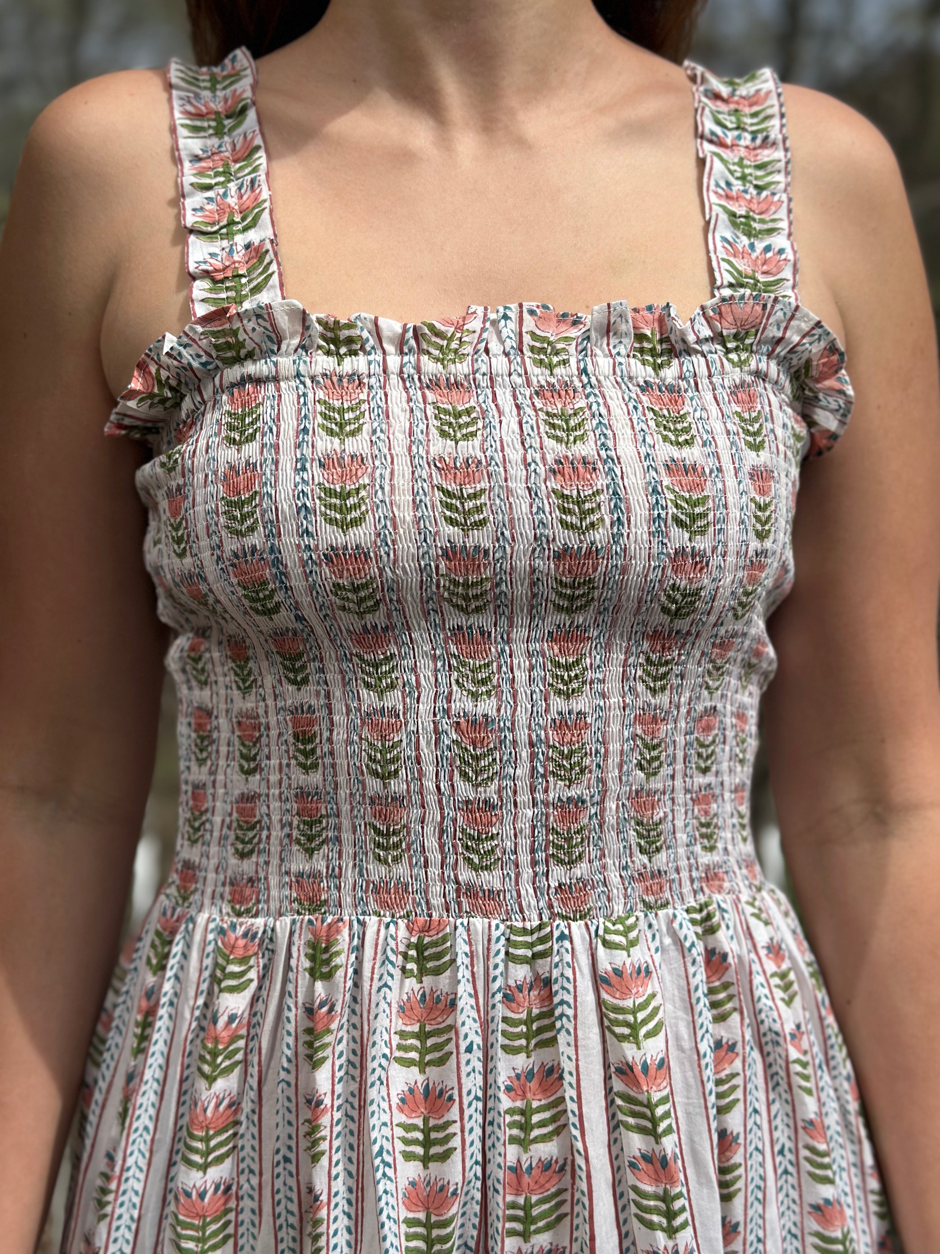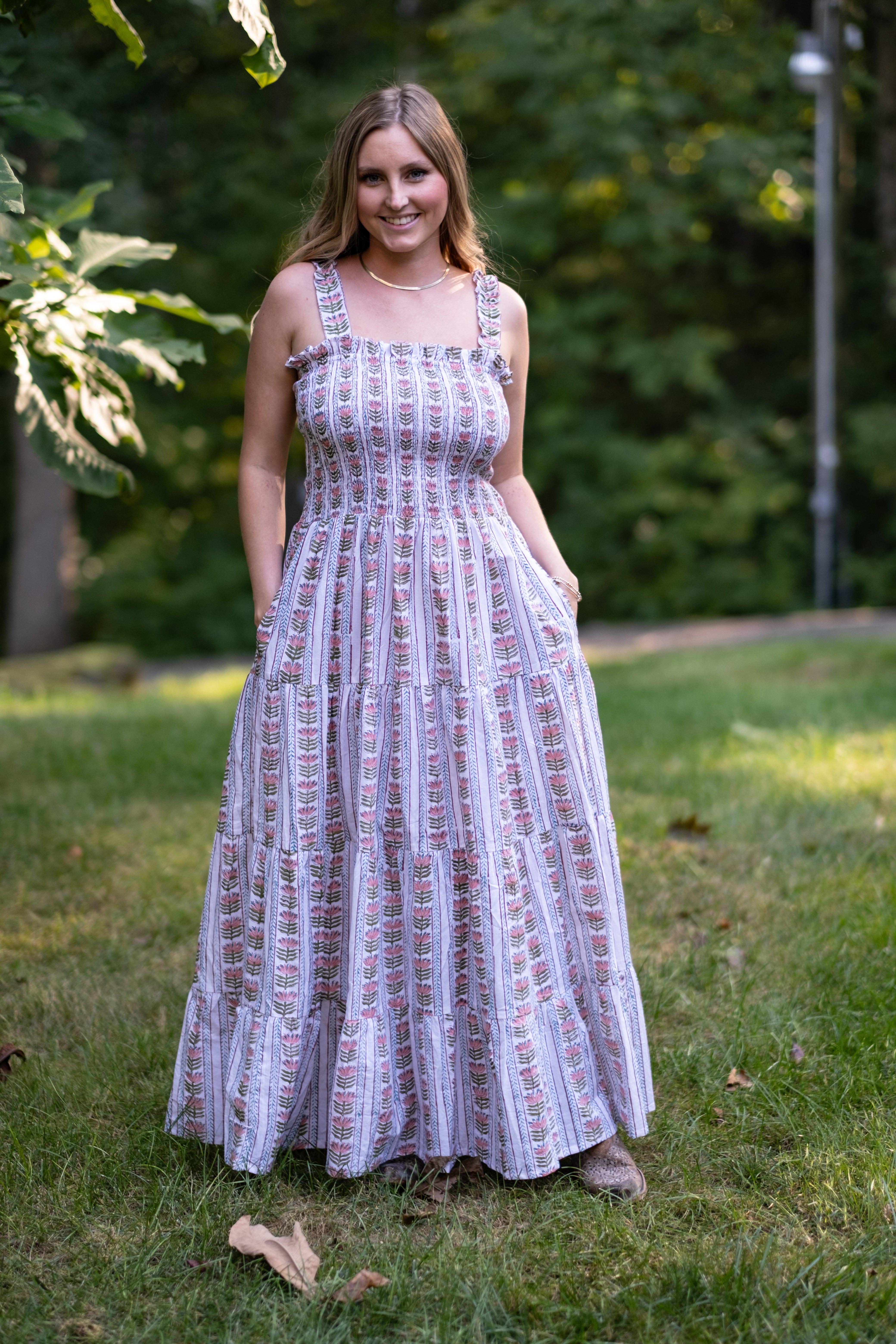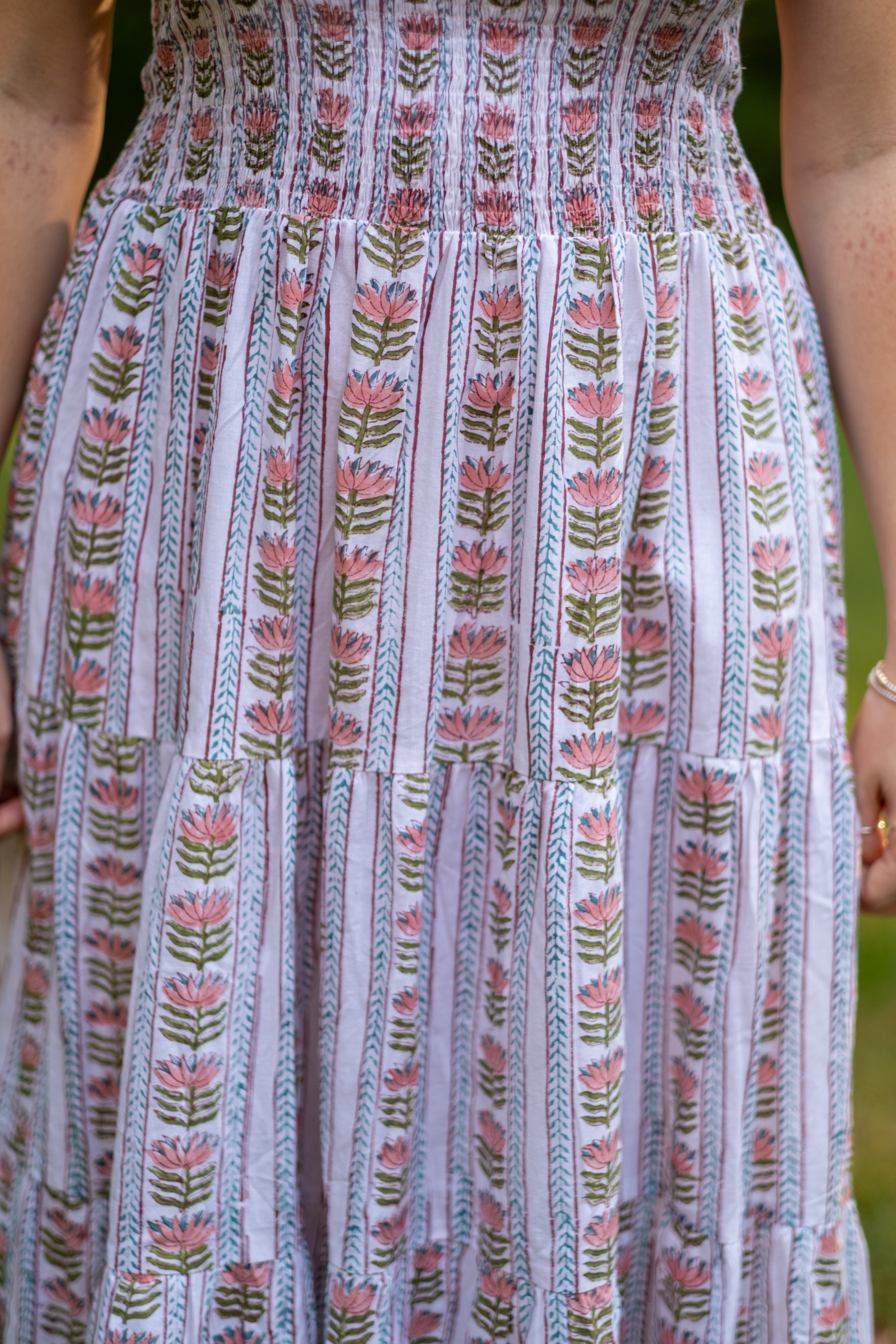 Meet Valerie, made from 100% organic cotton and hand painted with vegetable dyes. Valerie features a soft repeating fabric painted with beautiful blooming tulips. Enjoy the two pockets that come in the maxi length skirt. This dress is form fitting through the square neck bodice and is tiered through the skirt, creating a beautiful A frame shape.